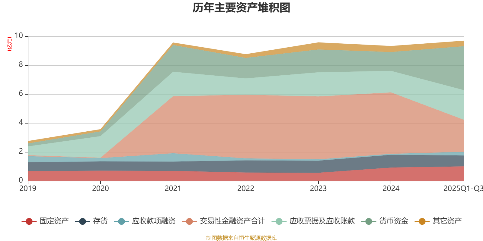 资产重大变化方面,截至2025年三季度末,公司交易性金融资产合计较上年末减少47.76%,占公司总资产比重下降22.68个百分点;货币资金较上年末增加132.76%,占公司总资产比重上升17.34个百分点;应收票据及应收账款较上年末增加37.94%,占公司总资产比重上升5.23个百分点;应收款项融资较上年末增加271.99%,占公司总资产比重上升1.9个百分点。