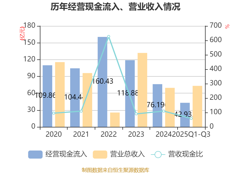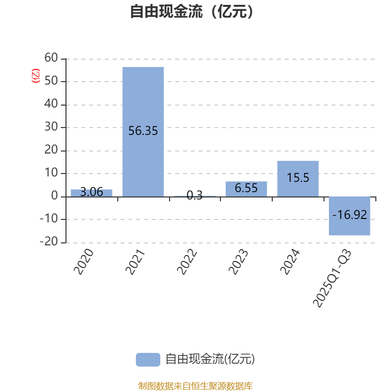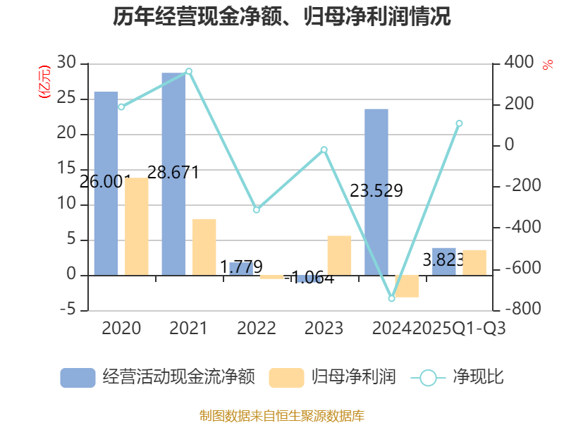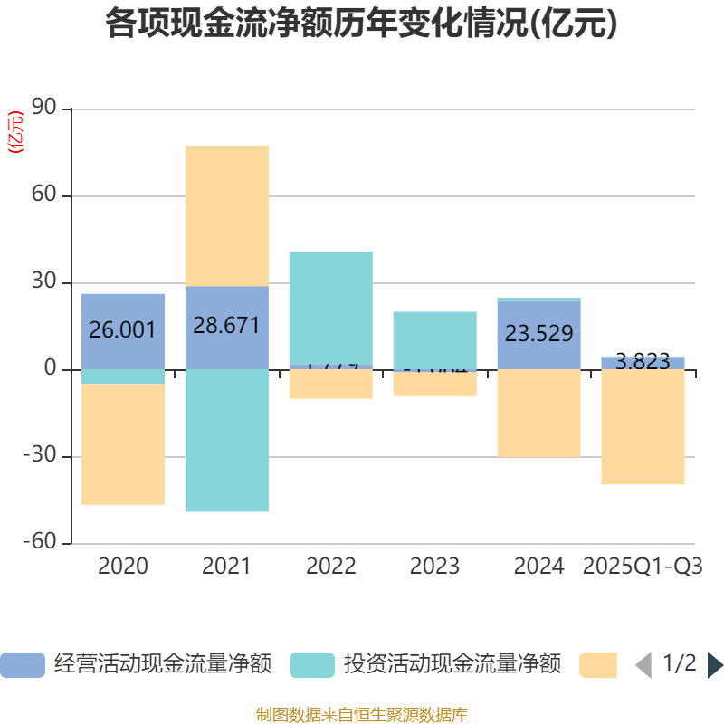 2025年前三季度,公司经营活动现金流净额为3.82亿元,同比下降15.12%;筹资活动现金流净额-39.75亿元,同比增加4.9亿元;投资活动现金流净额3955.58万元,上年同期为-1380.71万元。