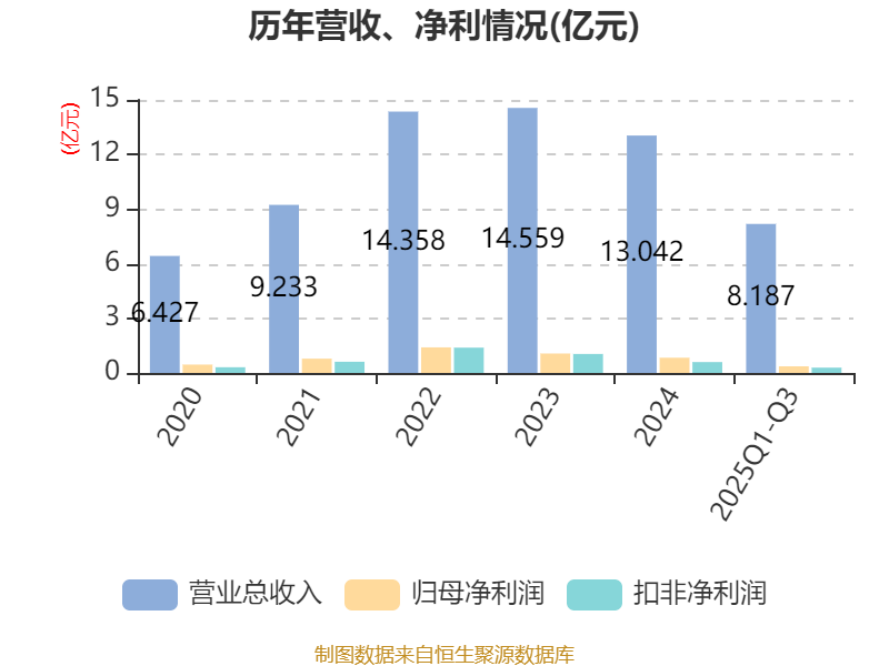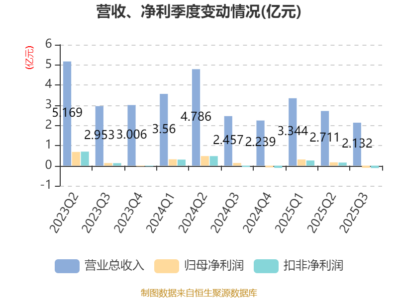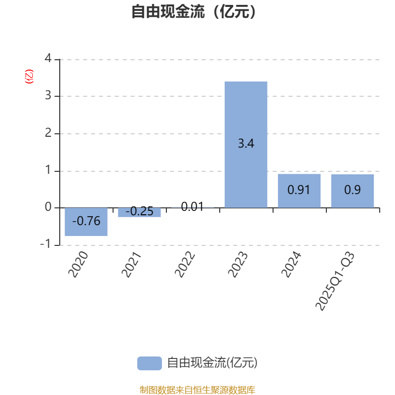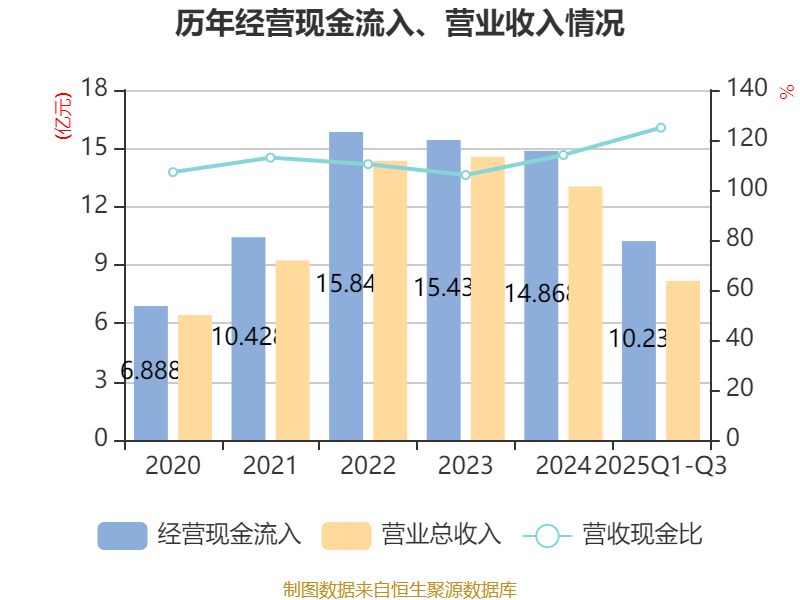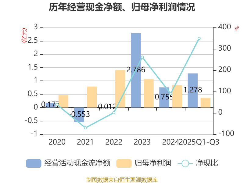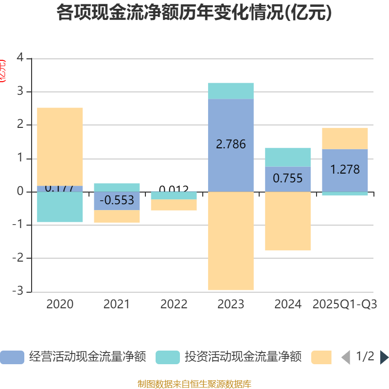 2025年前三季度,公司经营活动现金流净额为1.28亿元,同比下降21.93%;筹资活动现金流净额6354.46万元,同比增加2.79亿元;投资活动现金流净额-1112.97万元,上年同期为6490.14万元。