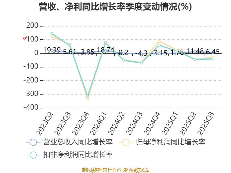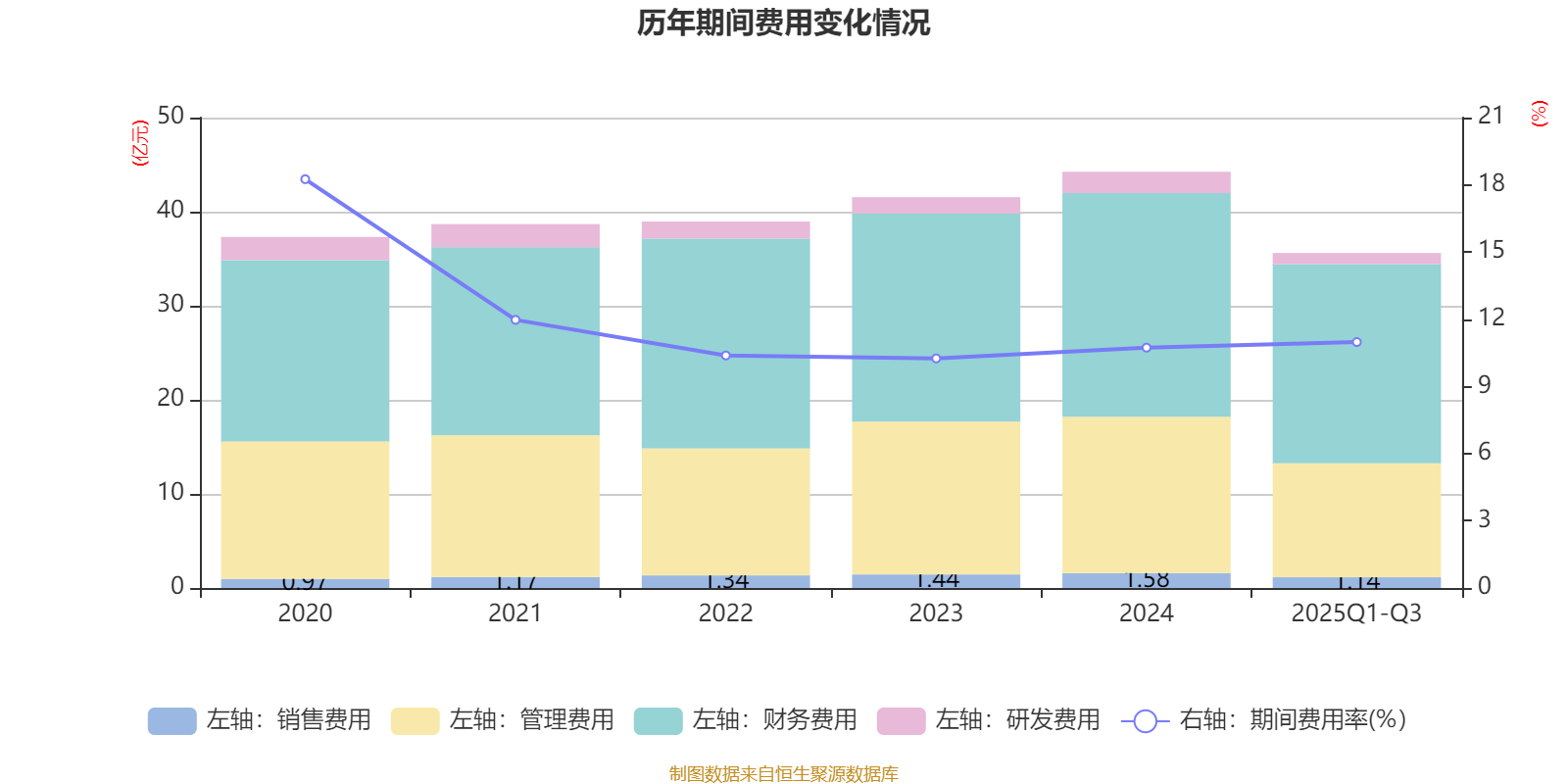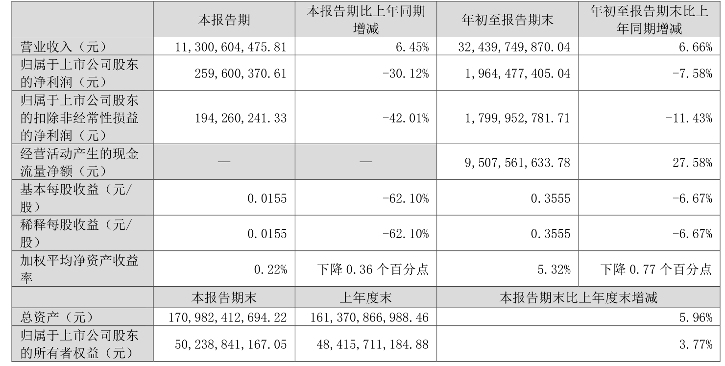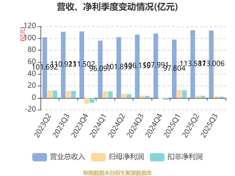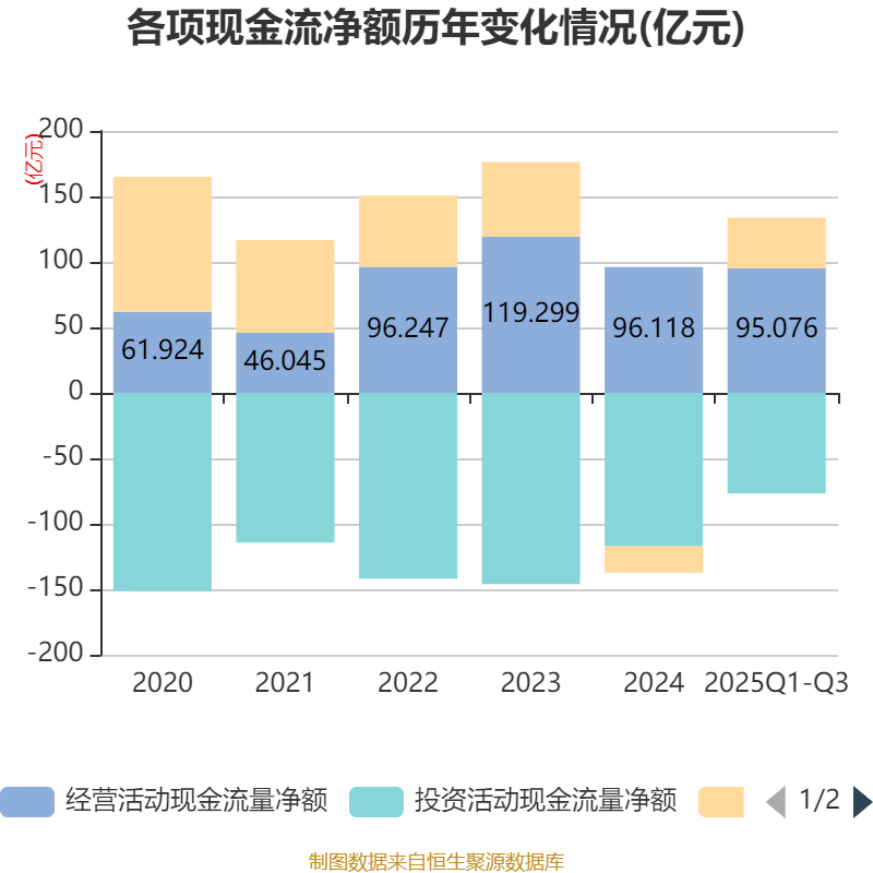 2025年前三季度,公司经营活动现金流净额为95.08亿元,同比增长27.58%;筹资活动现金流净额38.7亿元,同比增加20.36亿元;投资活动现金流净额-76.8亿元,上年同期为-76.86亿元。
