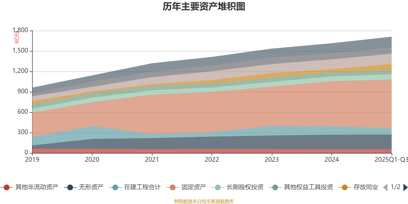 资产重大变化方面,截至2025年三季度末,公司存放同业款项较上年末增加107.33%,占公司总资产比重上升2.67个百分点;在建工程合计较上年末减少25.03%,占公司总资产比重下降2.24个百分点;固定资产较上年末增加7.6%,占公司总资产比重上升0.64个百分点;无形资产较上年末增加1.74%,占公司总资产比重下降0.53个百分点。