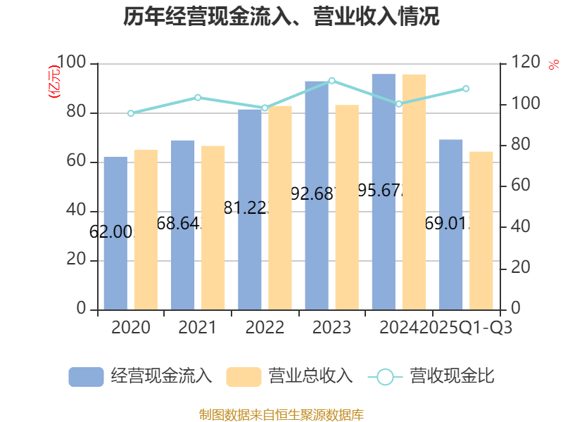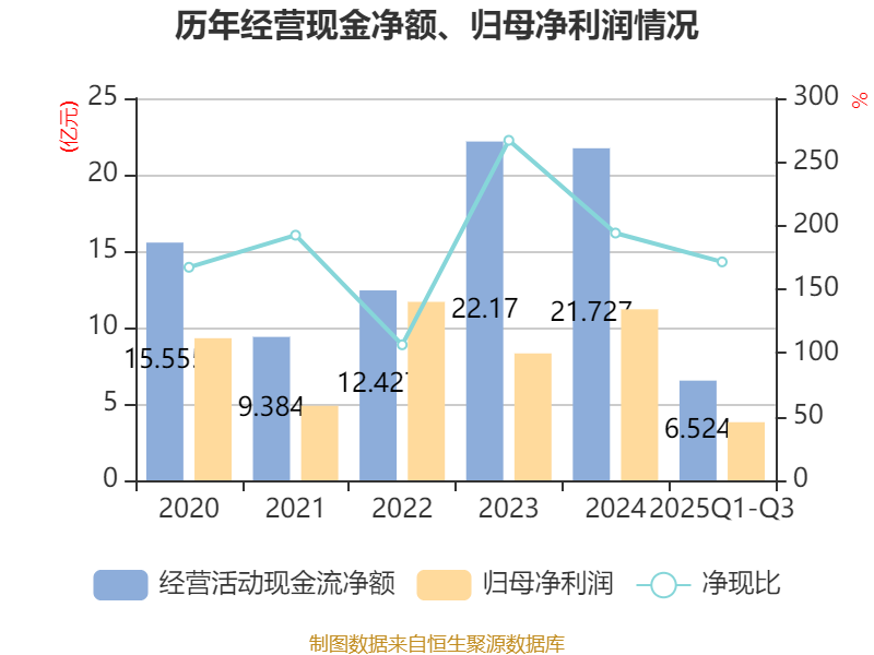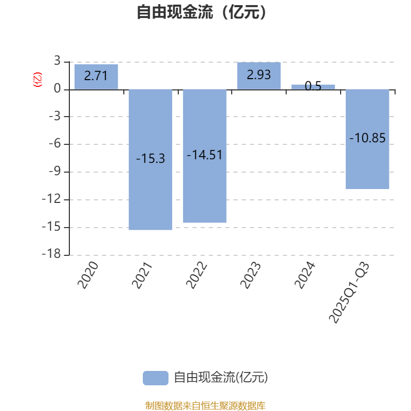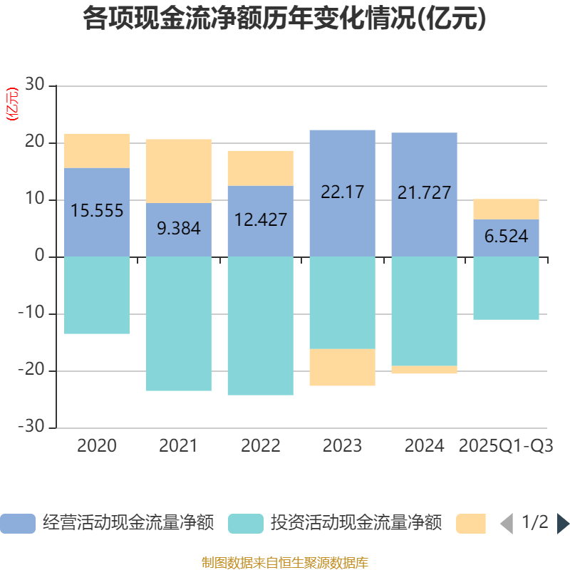 2025年前三季度,公司经营活动现金流净额为6.52亿元,同比下降65.25%;筹资活动现金流净额3.57亿元,同比增加9.63亿元;投资活动现金流净额-11.09亿元,上年同期为-11.85亿元。