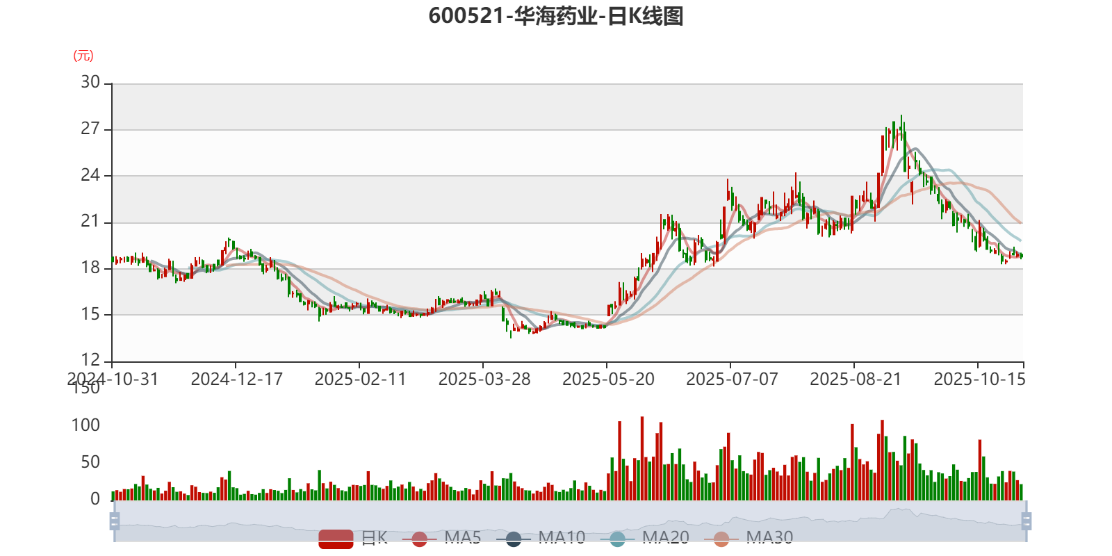 中证智能财讯华海药业(600521)10月31日披露2025年第三季度报告。前三季度公司实现营业总收入64.09亿元,同比下降11.57%;归母净利润3.8亿元,同比下降63.12%;扣非净利润2.7亿元,同比下降73.85%;经营活动产生的现金流量净额为6.52亿元,同比下降65.25%;报告期内,华海药业基本每股收益为0.26元,加权平均净资产收益率为4.01%。