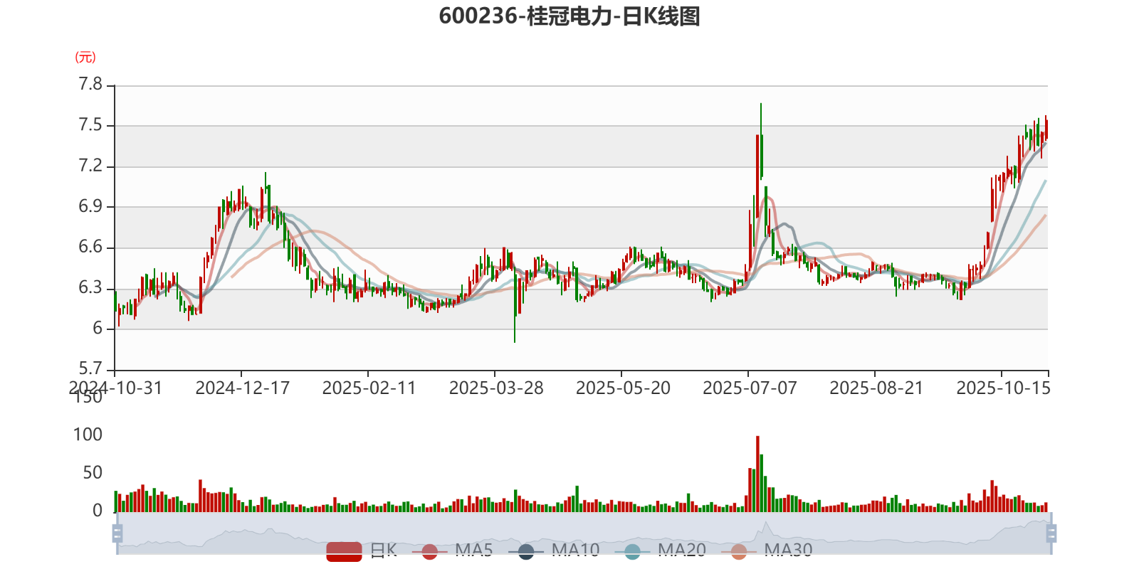 中证智能财讯桂冠电力(600236)10月31日披露2025年第三季度报告。前三季度公司实现营业总收入73.35亿元,同比下降0.25%;归母净利润24.19亿元,同比增长11.80%;扣非净利润24.3亿元,同比增长12.84%;经营活动产生的现金流量净额为52.78亿元,同比增长23.27%;报告期内,桂冠电力基本每股收益为0.3016元,加权平均净资产收益率为13.69%。