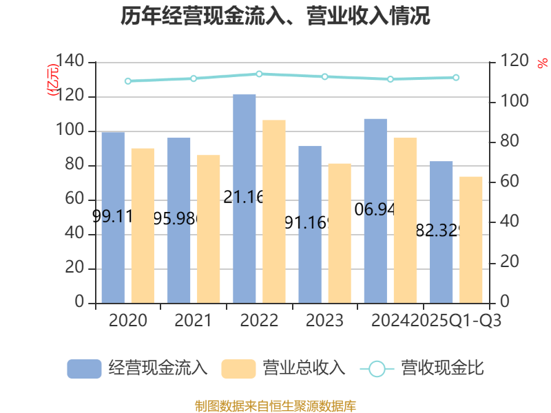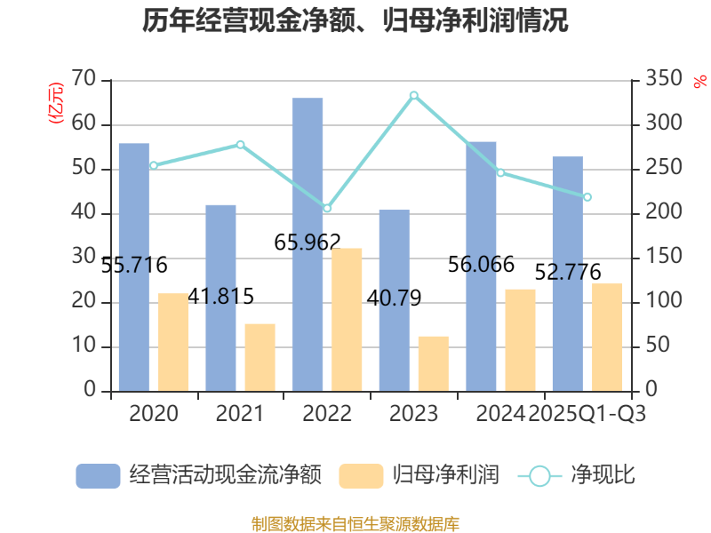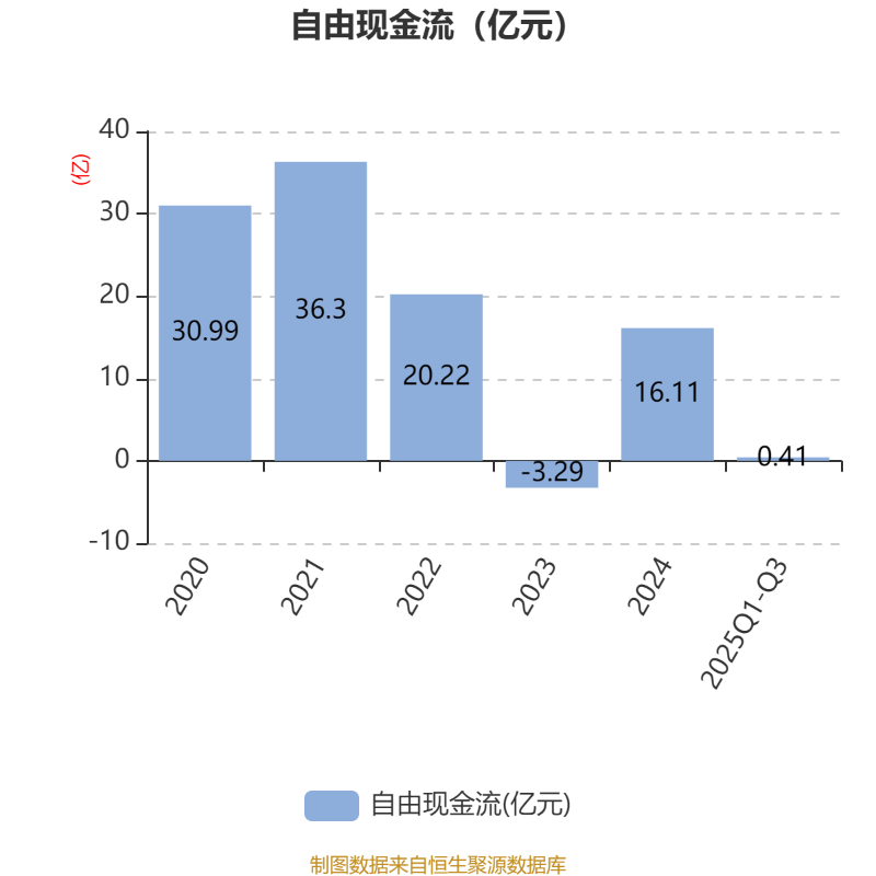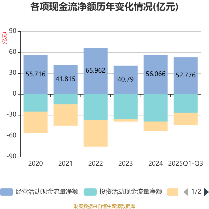 2025年前三季度,公司经营活动现金流净额为52.78亿元,同比增长23.27%;筹资活动现金流净额-18.12亿元,同比减少3.19亿元;投资活动现金流净额-26.77亿元,上年同期为-20.82亿元。