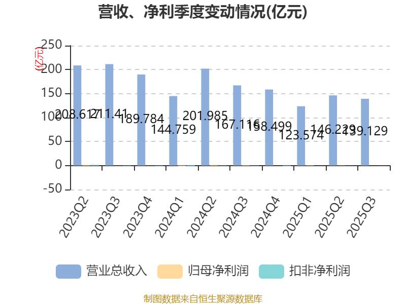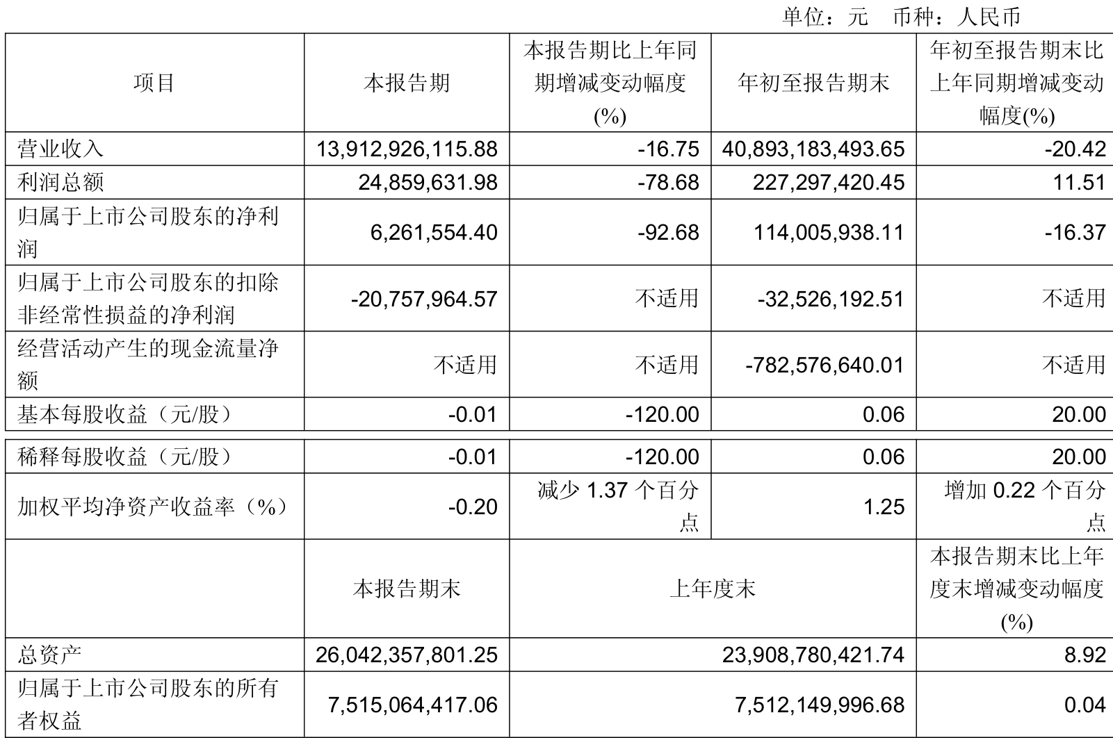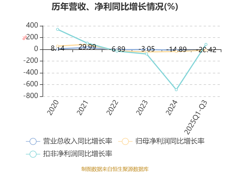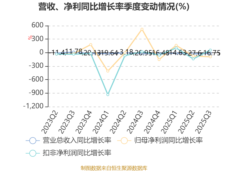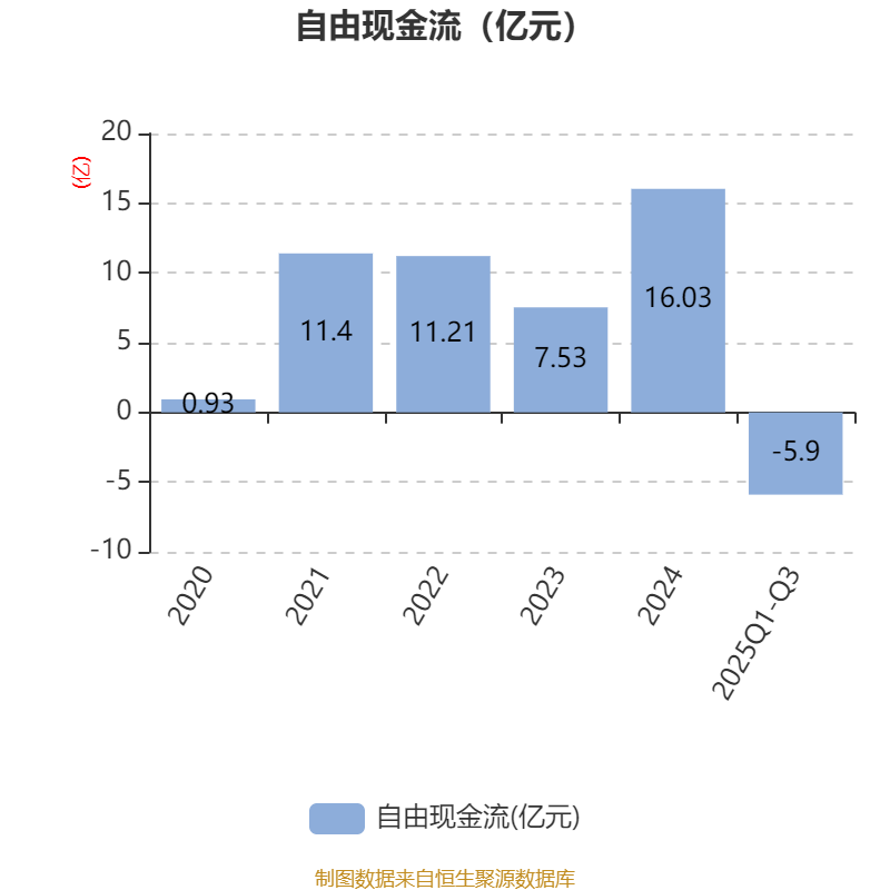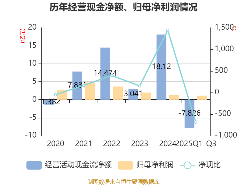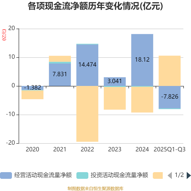2025年前三季度,公司经营活动现金流净额为-7.83亿元,同比增加19.02亿元;筹资活动现金流净额10.57亿元,同比减少16.2亿元;投资活动现金流净额-2600.07万元,上年同期为-1120.74万元。