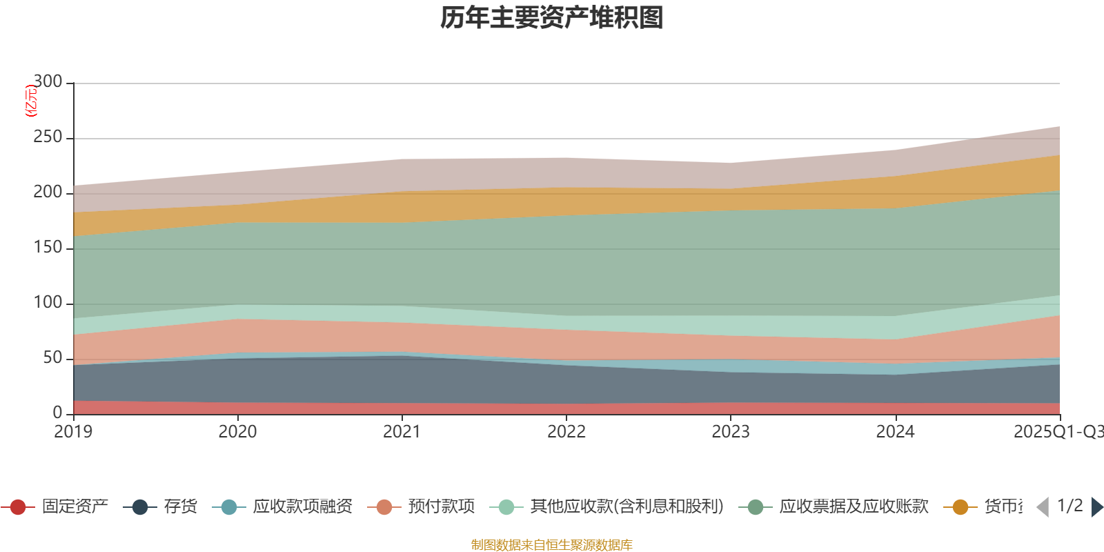 资产重大变化方面,截至2025年三季度末,公司预付款项较上年末增加73.18%,占公司总资产比重上升5.43个百分点;应收票据及应收账款较上年末减少2.65%,占公司总资产比重下降4.33个百分点;存货较上年末增加38.05%,占公司总资产比重上升2.85个百分点;其他应收款(含利息和股利)较上年末减少14.74%,占公司总资产比重下降1.92个百分点。