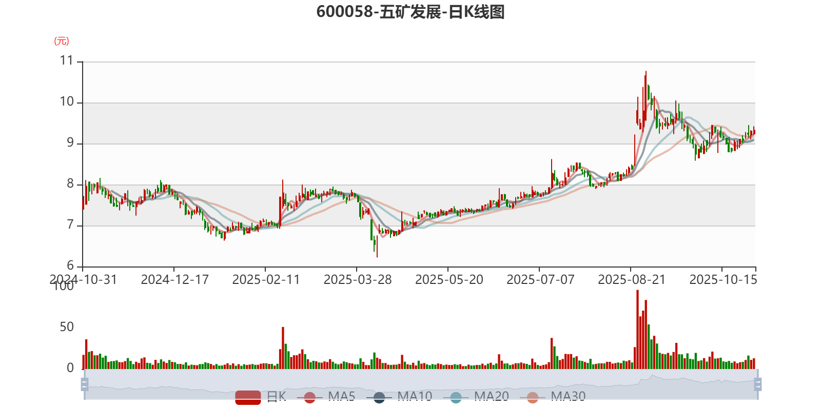 中证智能财讯五矿发展(600058)10月31日披露2025年第三季度报告。前三季度公司实现营业总收入408.93亿元,同比下降20.42%;归母净利润1.14亿元,同比下降16.37%;扣非净利润亏损3252.62万元,上年同期亏损1.92亿元;经营活动产生的现金流量净额为-7.83亿元,上年同期为-26.85亿元;报告期内,五矿发展基本每股收益为0.06元,加权平均净资产收益率为1.25%。