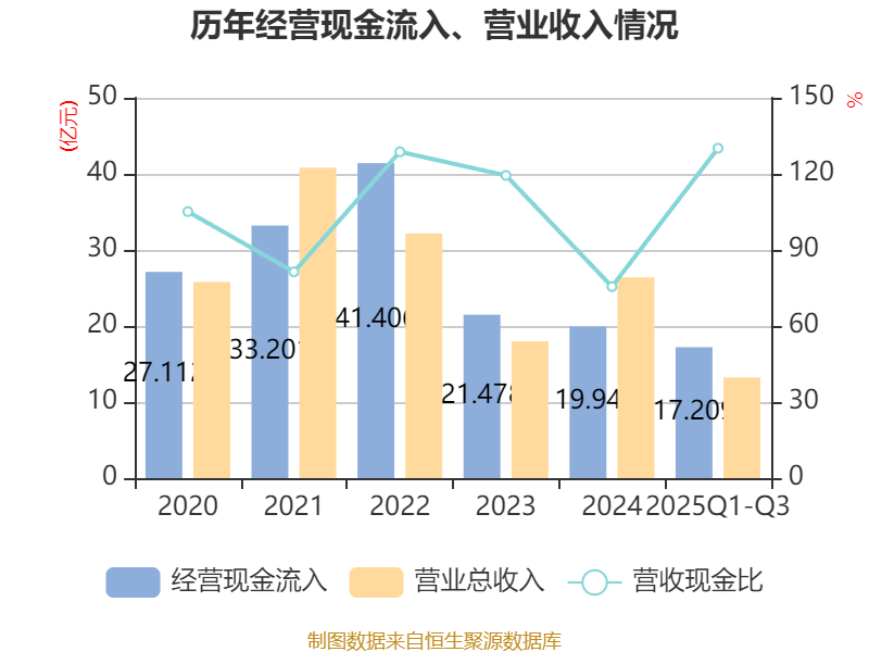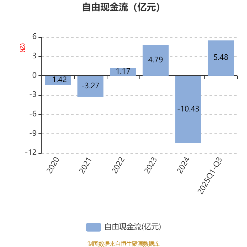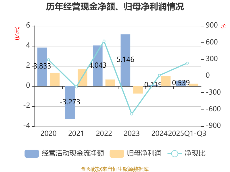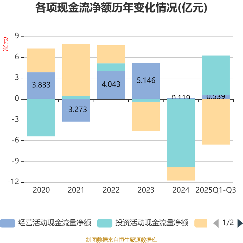 2025年前三季度,公司经营活动现金流净额为5394.09万元,同比增加8777.35万元;筹资活动现金流净额-6.57亿元,同比减少4.72亿元;投资活动现金流净额5.72亿元,上年同期为-4.55亿元。