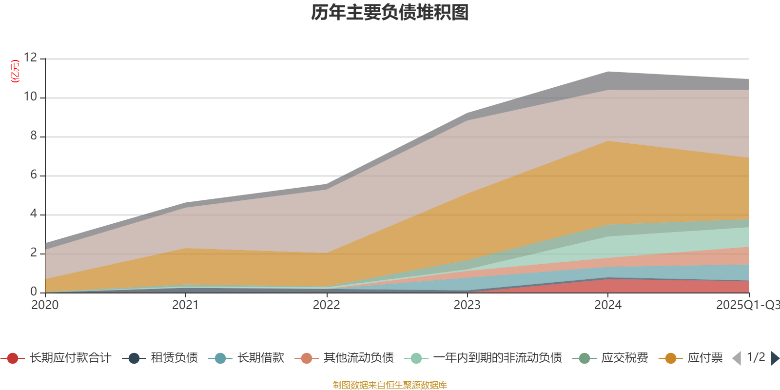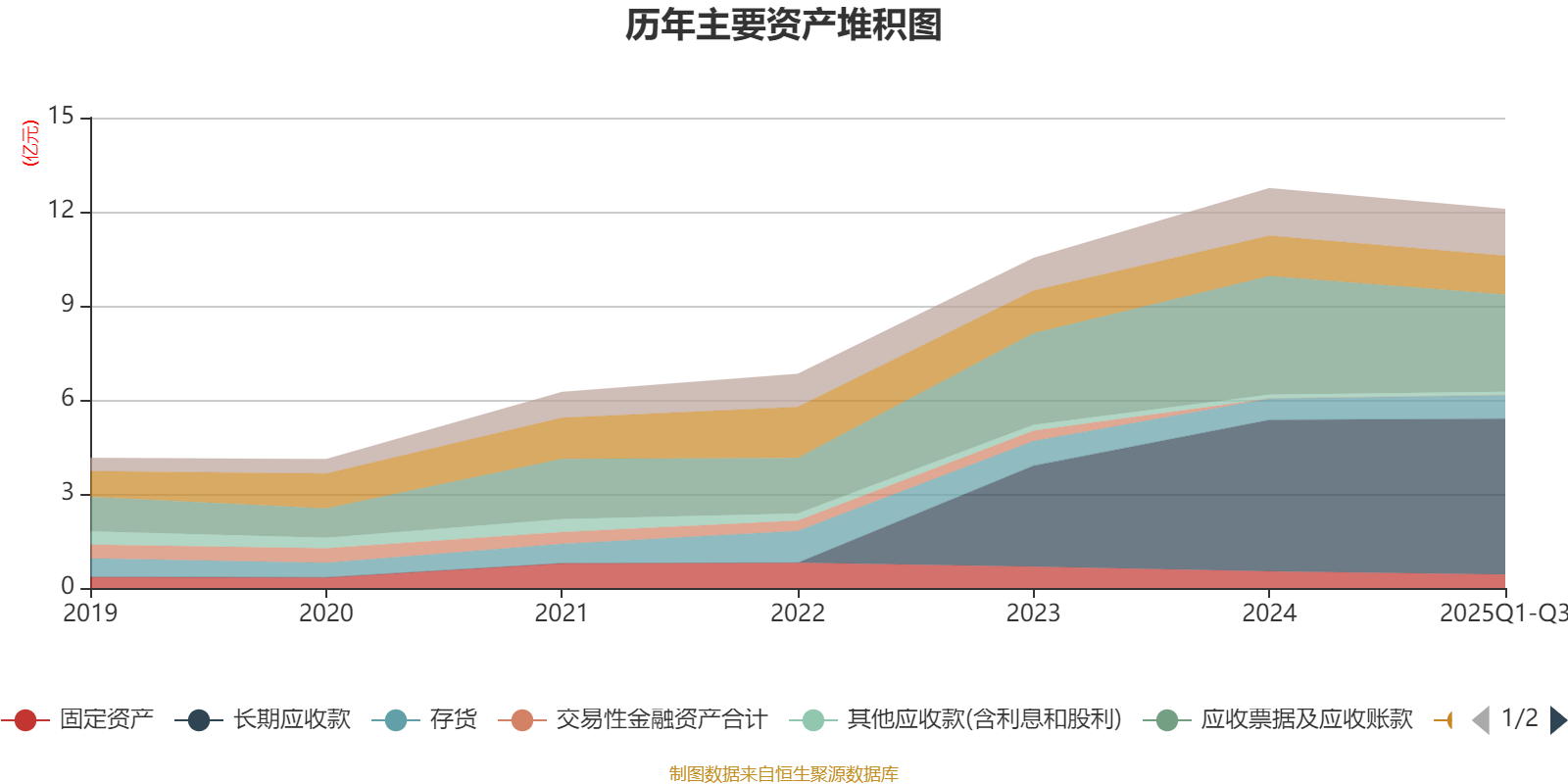 资产重大变化方面,截至2025年三季度末,公司应收票据及应收账款较上年末减少17.96%,占公司总资产比重下降3.99个百分点;长期应收款较上年末增加2.94%,占公司总资产比重上升3.27个百分点;预付款项较上年末增加100.09%,占公司总资产比重上升1.28个百分点;存货较上年末增加9.36%,占公司总资产比重上升0.82个百分点。