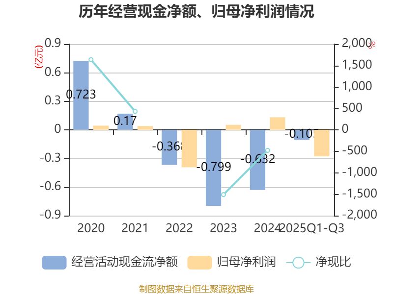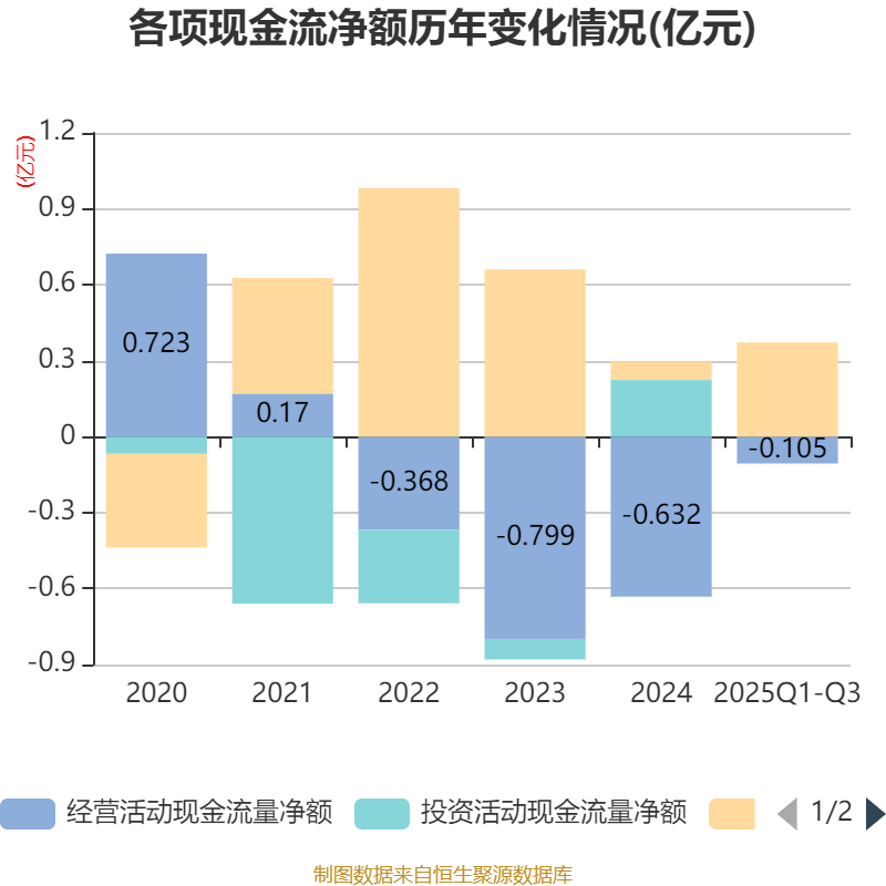 2025年前三季度,公司经营活动现金流净额为-1046.95万元,同比增加1.09亿元;筹资活动现金流净额3720.05万元,同比减少4592.88万元;投资活动现金流净额-21.84万元,上年同期为-7.78万元。