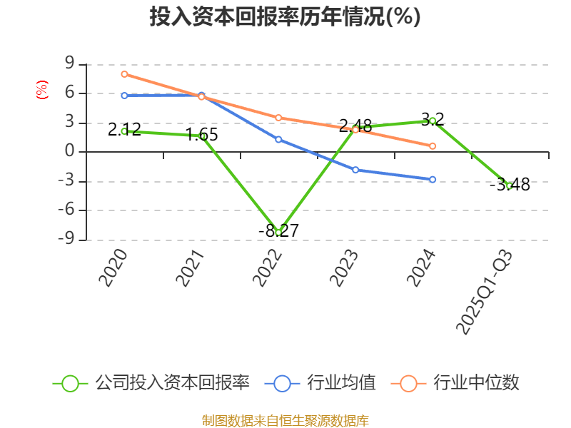 盈利能力方面, 2025年前三季度公司加权平均净资产收益率为-21.78%,同比下降18.48个百分点。公司2025年前三季度投入资本回报率为-3.48%,较上年同期下降4.05个百分点。