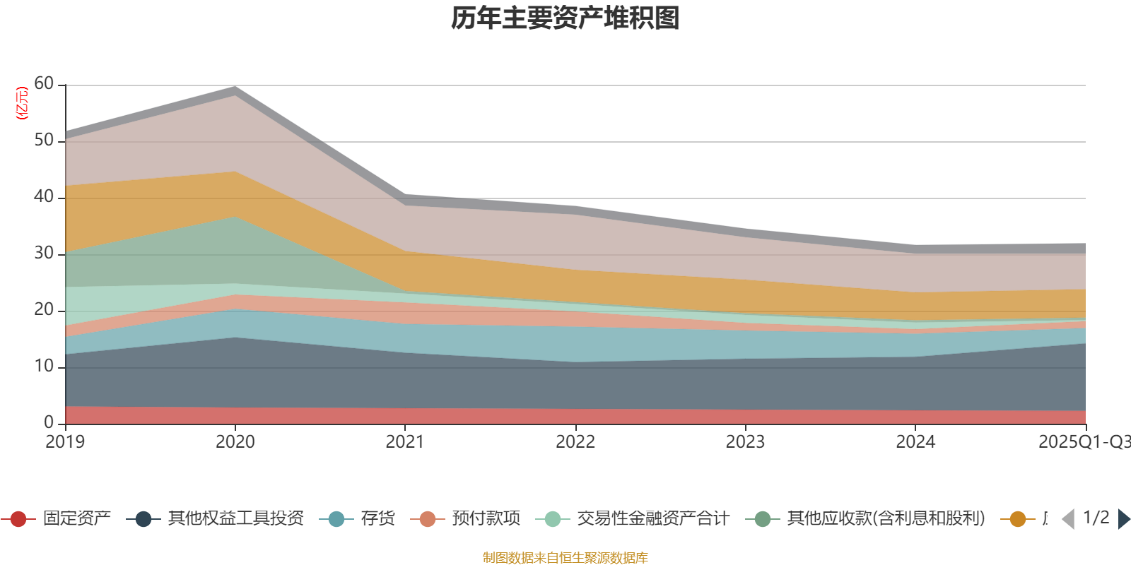资产重大变化方面,截至2025年三季度末,公司其他权益工具投资较上年末增加26.01%,占公司总资产比重上升7.47个百分点;存货较上年末减少33.79%,占公司总资产比重下降4.45个百分点;交易性金融资产合计较上年末减少85.84%,占公司总资产比重下降3.18个百分点;货币资金较上年末减少8.5%,占公司总资产比重下降2.02个百分点。