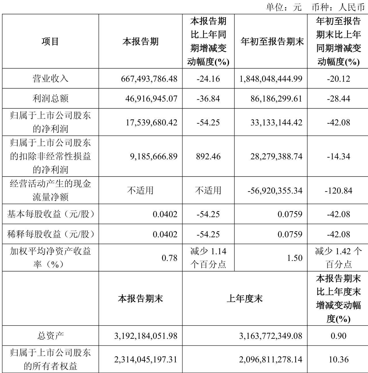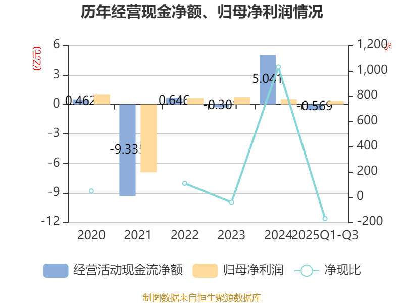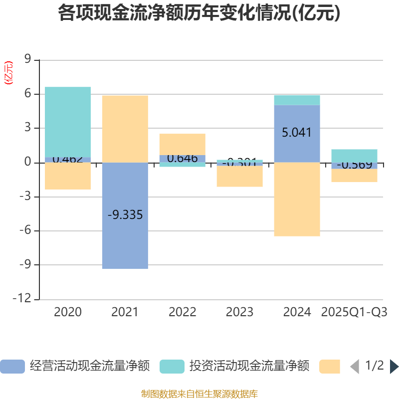 2025年前三季度,公司经营活动现金流净额为-5692.04万元,同比减少3.3亿元;筹资活动现金流净额-1.15亿元,同比增加3.62亿元;投资活动现金流净额1.15亿元,上年同期为2019.53万元。