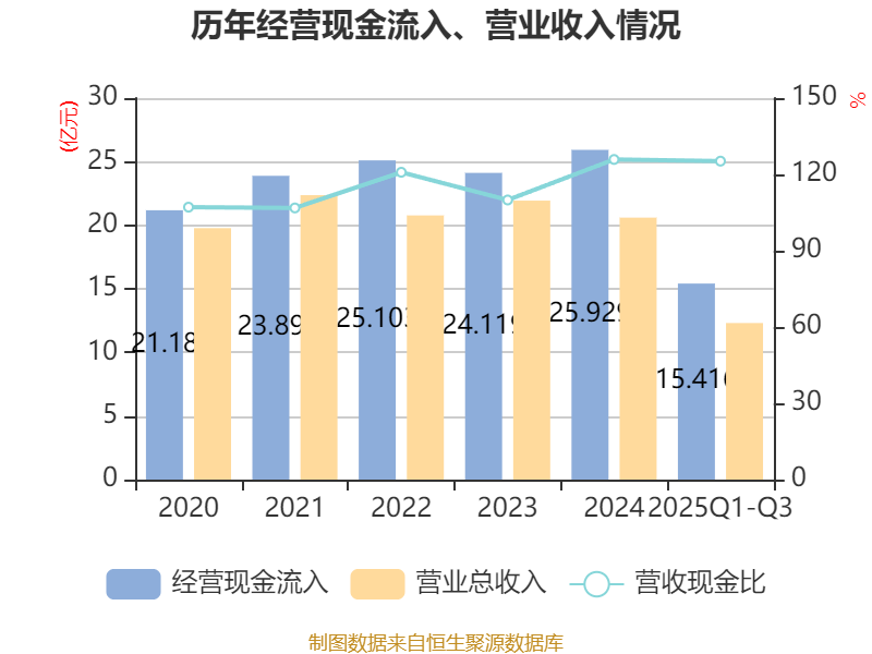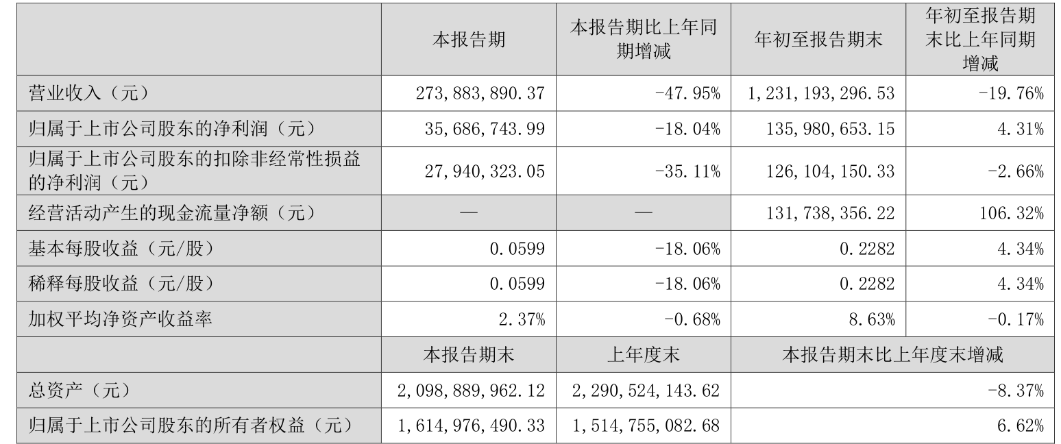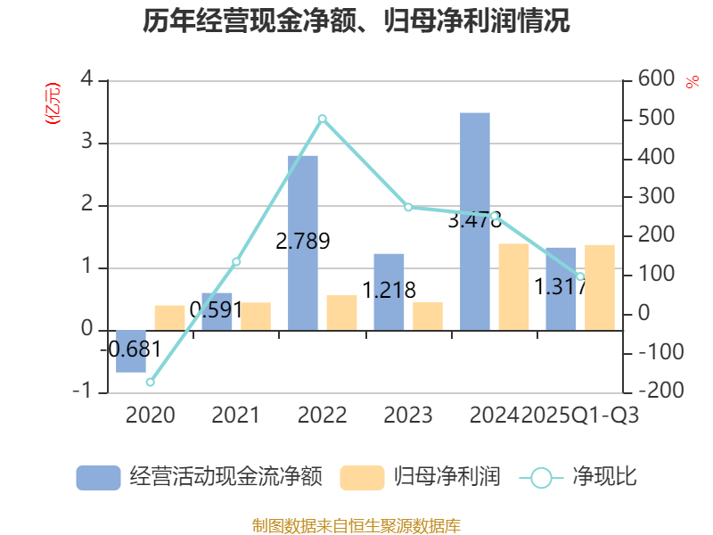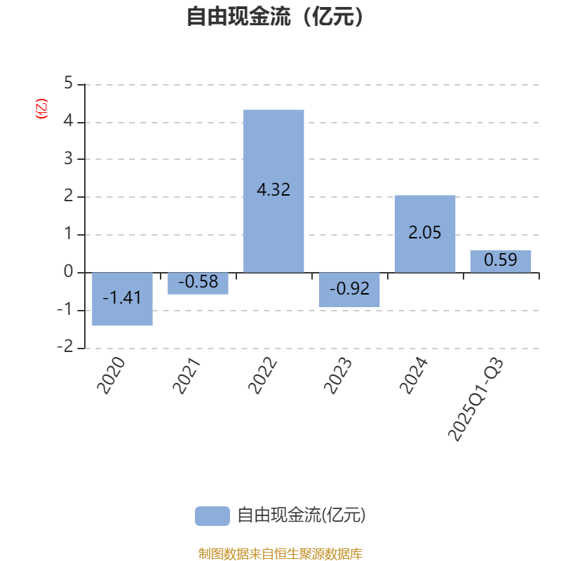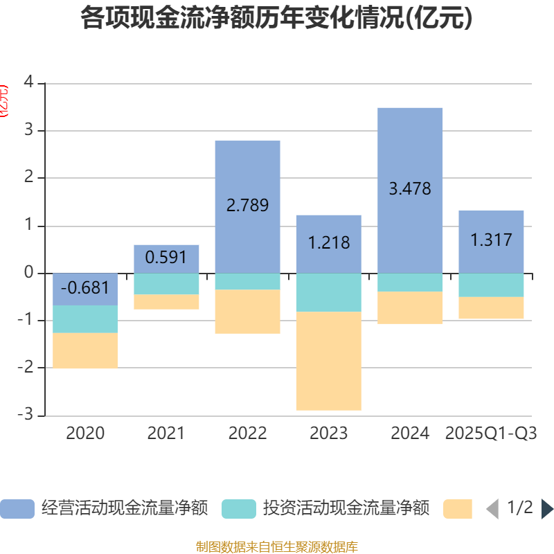 2025年前三季度,公司经营活动现金流净额为1.32亿元,同比增长106.32%;筹资活动现金流净额-4568.28万元,同比增加1626.27万元;投资活动现金流净额-5040.74万元,上年同期为-1765.7万元。