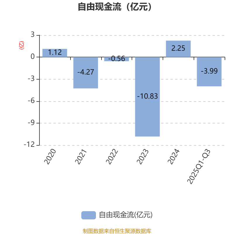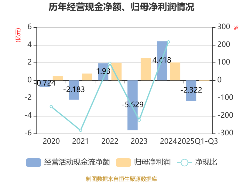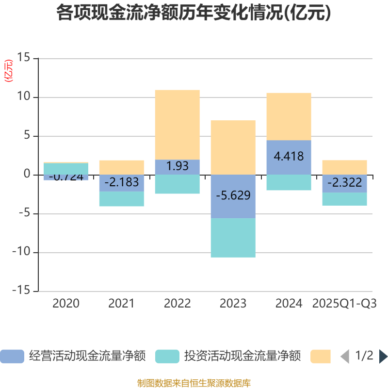 2025年前三季度,公司经营活动现金流净额为-2.32亿元,同比减少4.22亿元;筹资活动现金流净额1.86亿元,同比减少1.51亿元;投资活动现金流净额-1.68亿元,上年同期为-8651.21万元。