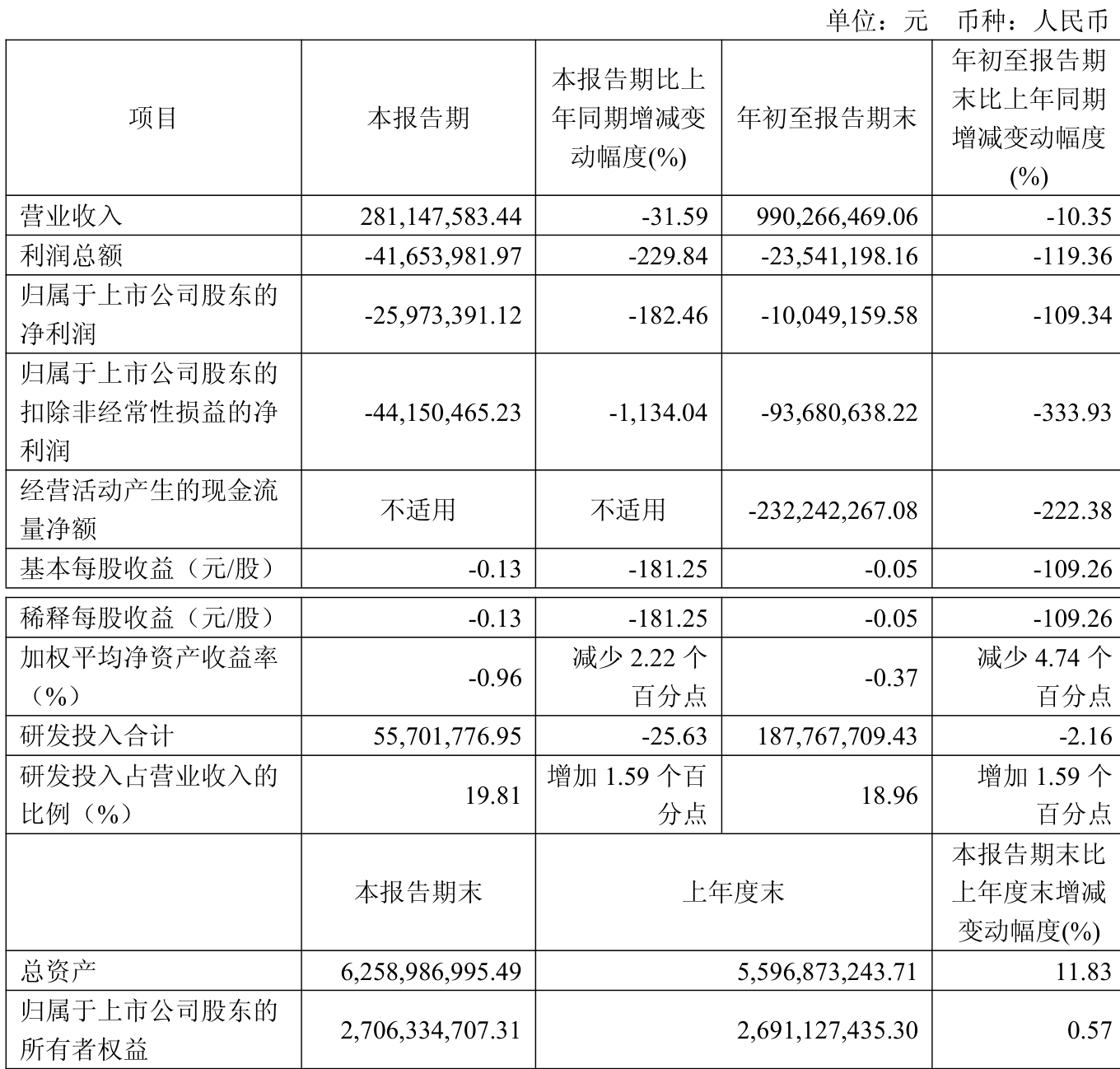 中证智能财讯芯源微(688037)10月31日披露2025年第三季度报告。前三季度公司实现营业总收入9.9亿元,同比下降10.35%;归母净利润亏损1004.92万元,上年同期盈利1.08亿元;扣非净利润亏损9368.06万元,上年同期盈利4004.6万元;经营活动产生的现金流量净额为-2.32亿元,上年同期为1.9亿元;报告期内,芯源微基本每股收益为-0.05元,加权平均净资产收益率为-0.37%。