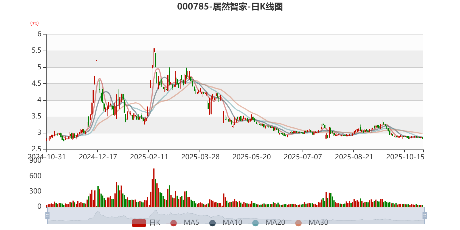 中证智能财讯居然智家(000785)10月31日披露2025年第三季度报告。前三季度公司实现营业总收入91.59亿元,同比下降3.38%;归母净利润3.98亿元,同比下降45.58%;扣非净利润4.44亿元,同比下降45.61%;经营活动产生的现金流量净额为13.45亿元,同比下降25.35%;报告期内,居然智家基本每股收益为0.06元,加权平均净资产收益率为1.95%。