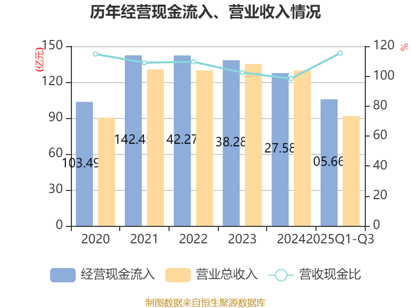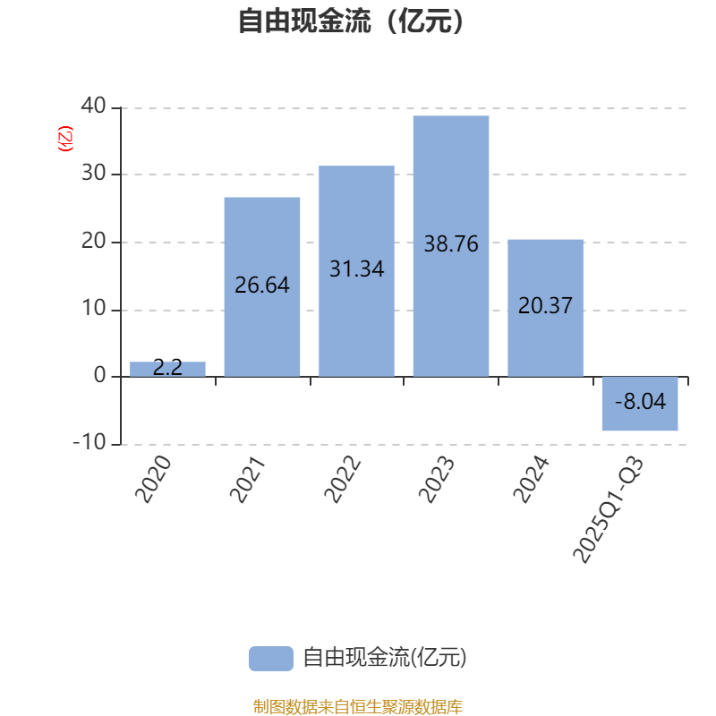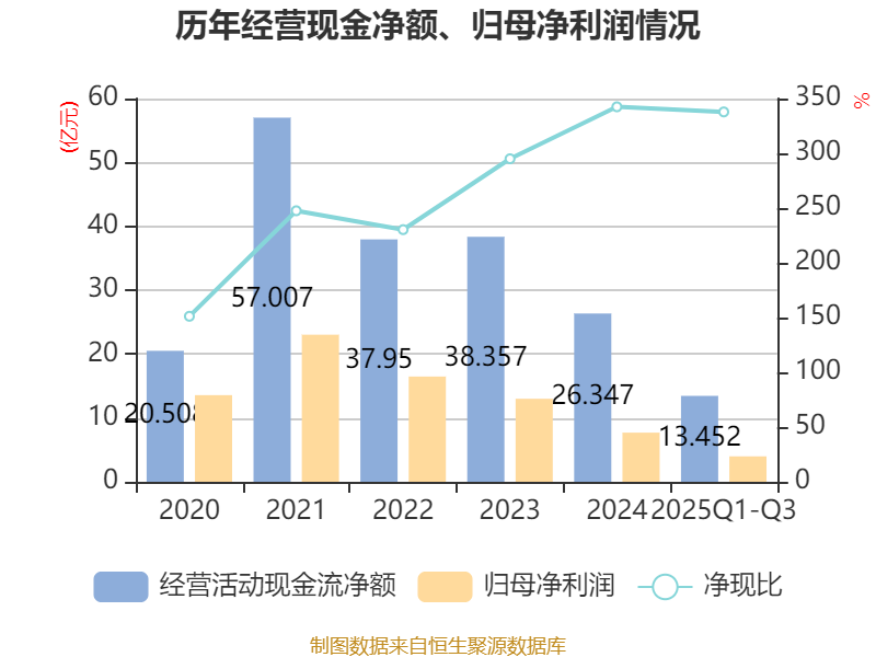 2025年前三季度,公司经营活动现金流净额为13.45亿元,同比下降25.35%;筹资活动现金流净额-21.69亿元,同比减少2.86亿元;投资活动现金流净额-4.68亿元,上年同期为-9.43亿元。