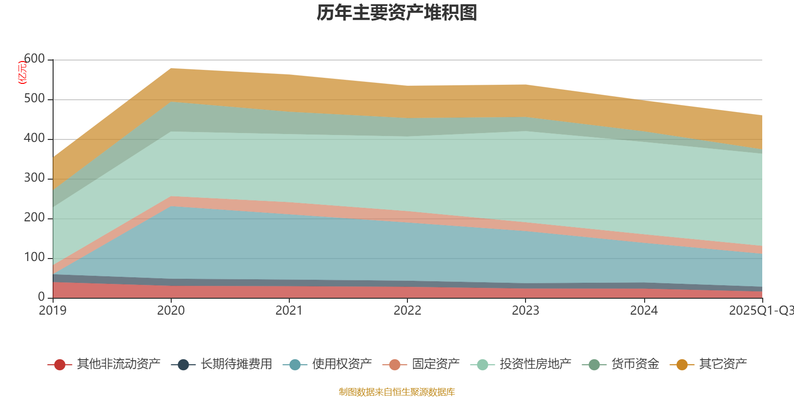 资产重大变化方面,截至2025年三季度末,公司投资性房地产较上年末减少0.2%,占公司总资产比重上升3.71个百分点;货币资金较上年末减少59.15%,占公司总资产比重下降2.99个百分点;使用权资产较上年末减少17.17%,占公司总资产比重下降2.1个百分点;无形资产较上年末增加112.42%,占公司总资产比重上升1.48个百分点。