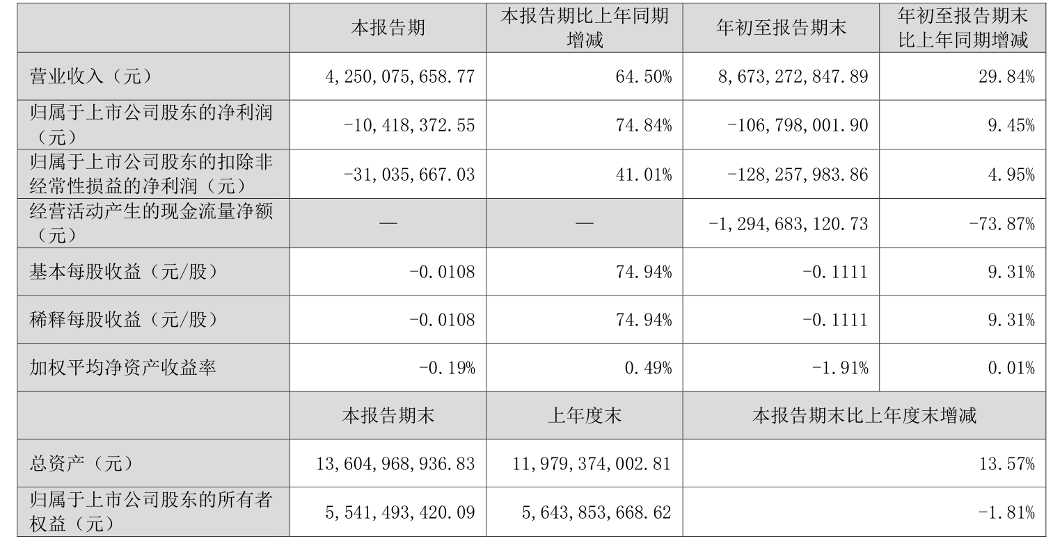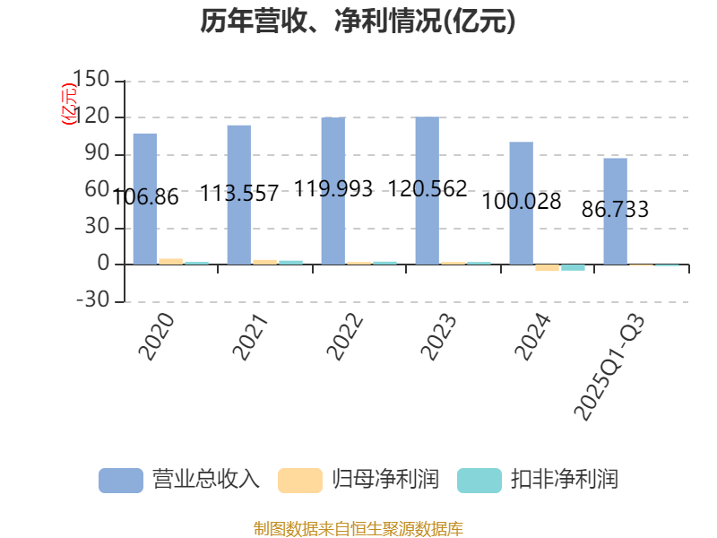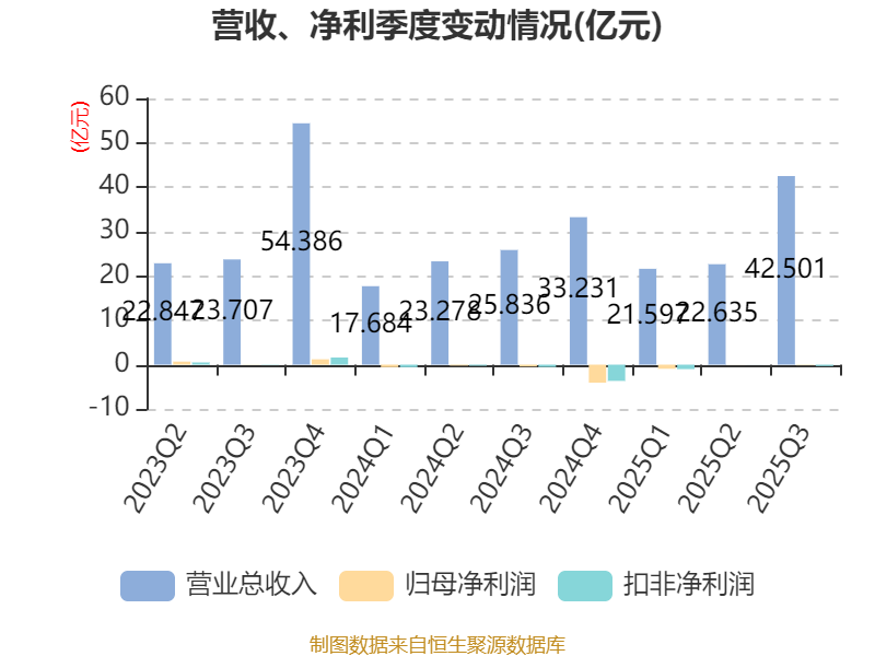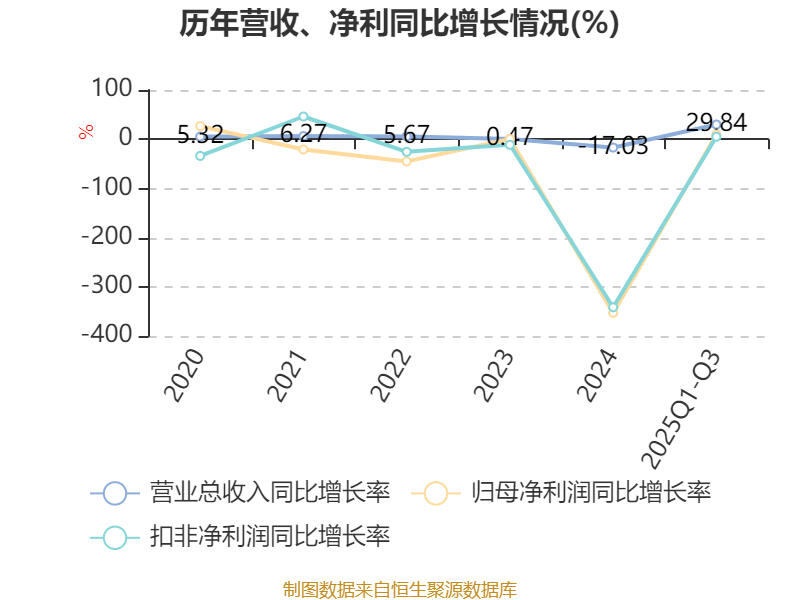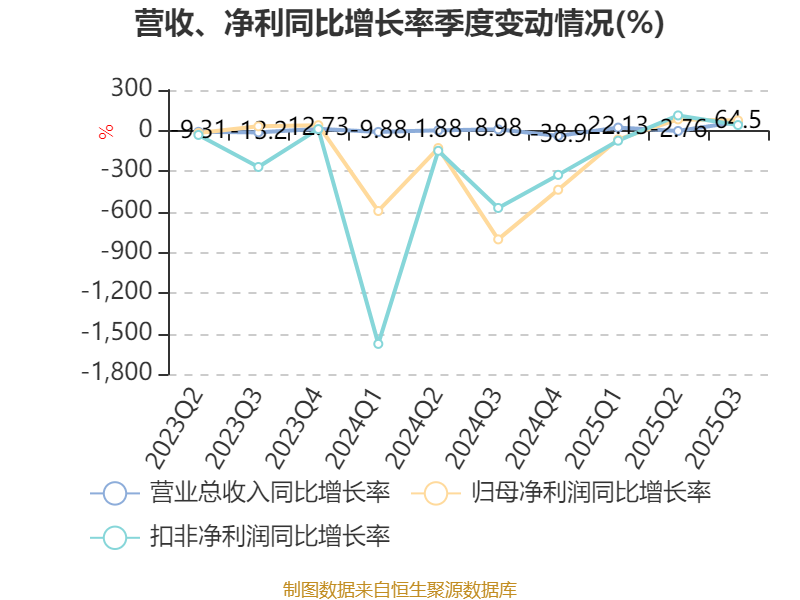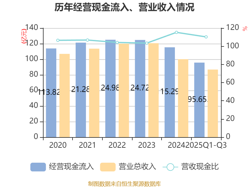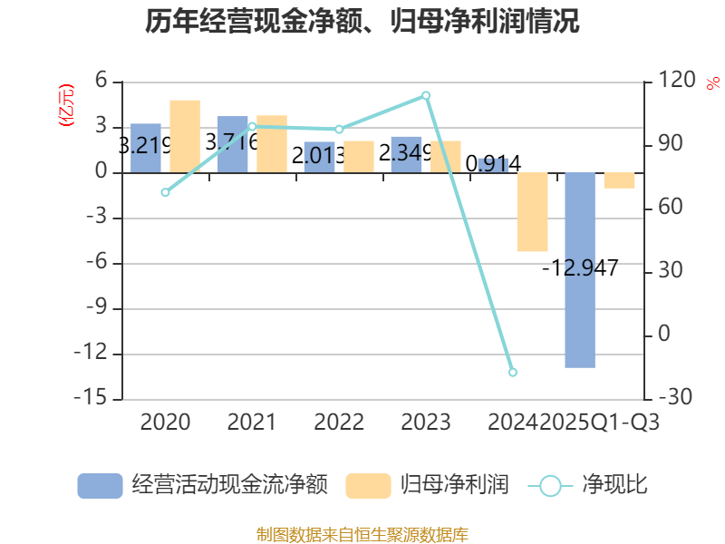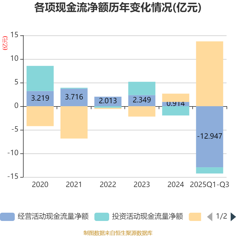 2025年前三季度,公司经营活动现金流净额为-12.95亿元,同比减少5.5亿元;筹资活动现金流净额13.74亿元,同比增加6.24亿元;投资活动现金流净额-1.31亿元,上年同期为-11.32亿元。
