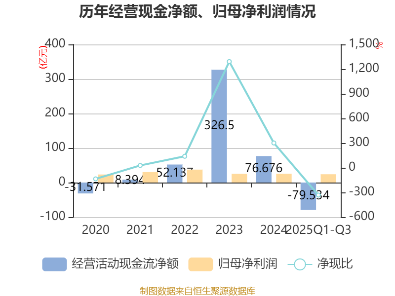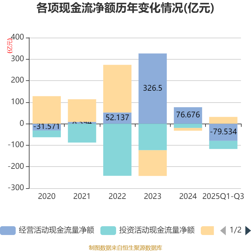 2025年前三季度,公司经营活动现金流净额为-79.53亿元,同比减少65.46亿元;筹资活动现金流净额31.61亿元,同比增加46.77亿元;投资活动现金流净额-37.88亿元,上年同期为-6.51亿元。