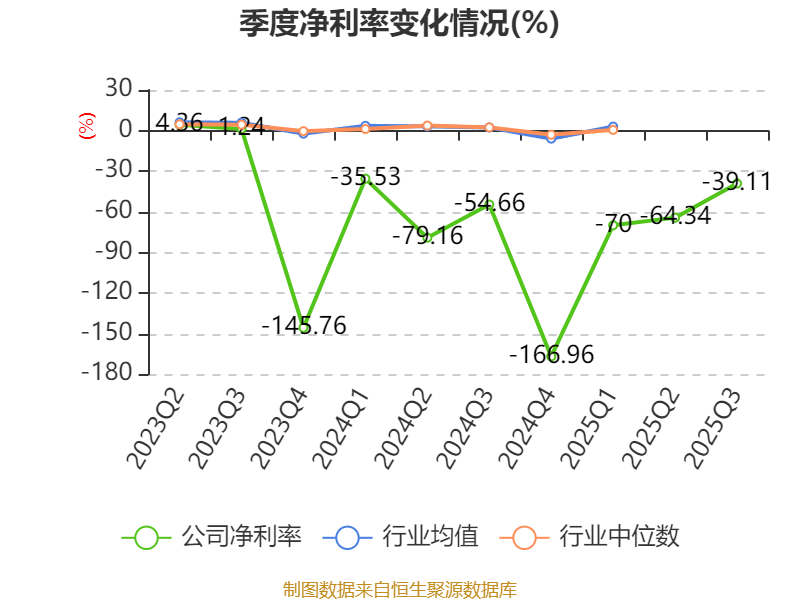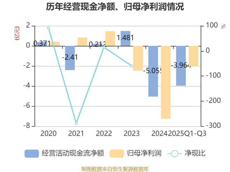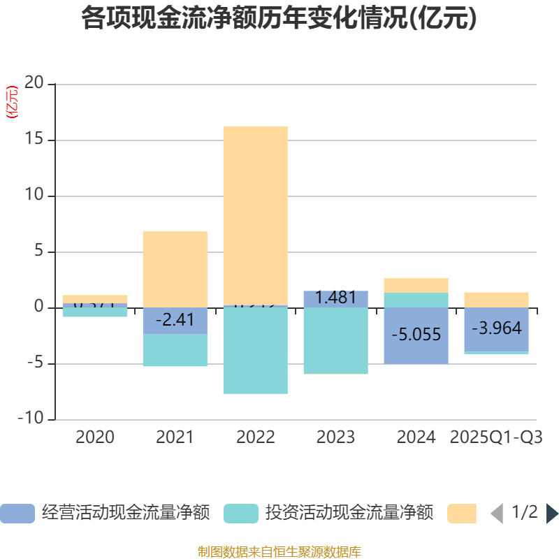 2025年前三季度,公司经营活动现金流净额为-3.96亿元,同比增加3416.62万元;筹资活动现金流净额1.34亿元,同比增加1.14亿元;投资活动现金流净额-2157.38万元,上年同期为-5673.76万元。