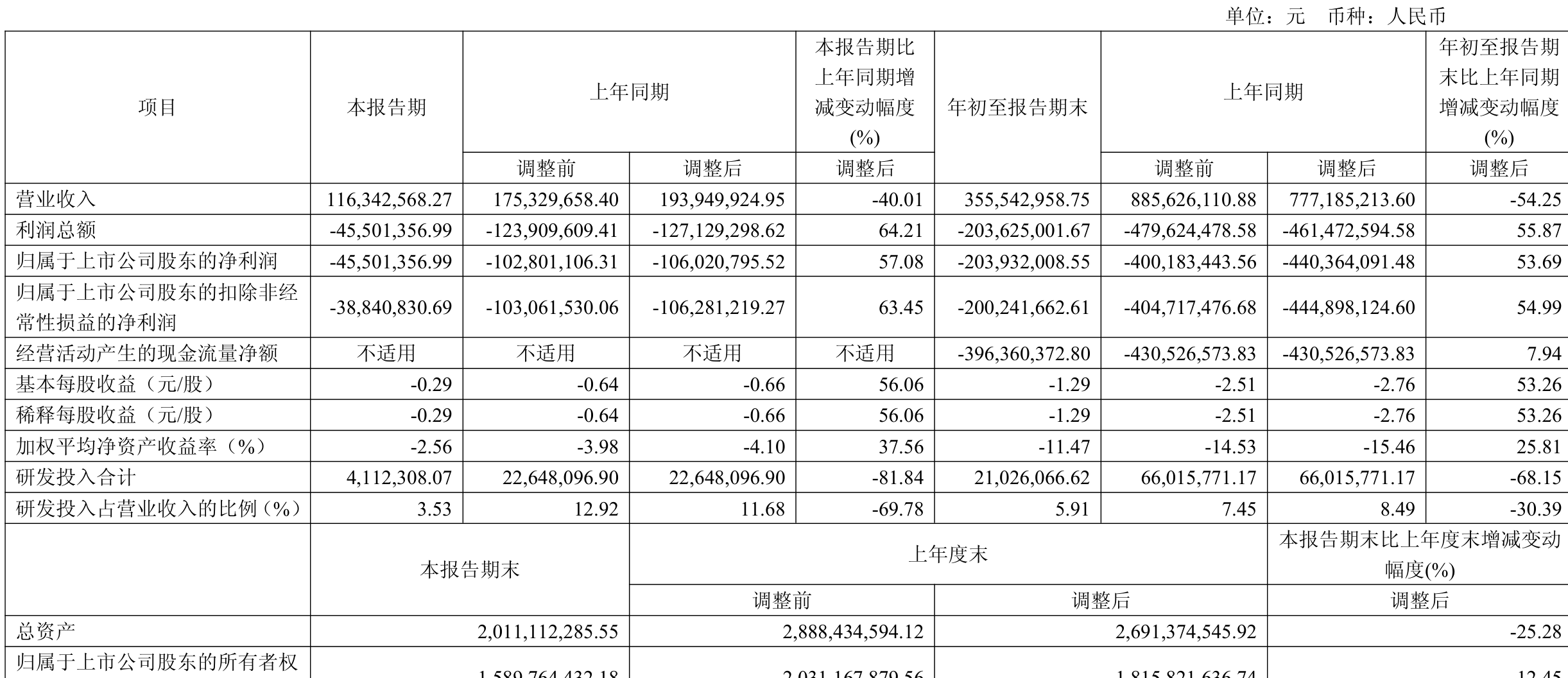 中证智能财讯 ST帕瓦(688184)10月31日披露2025年第三季度报告。前三季度公司实现营业总收入3.56亿元,同比下降54.25%;归母净利润亏损2.04亿元,上年同期亏损4.4亿元;扣非净利润亏损2亿元,上年同期亏损4.45亿元;经营活动产生的现金流量净额为-3.96亿元,上年同期为-4.31亿元;报告期内,ST帕瓦基本每股收益为-1.29元,加权平均净资产收益率为-11.47%。