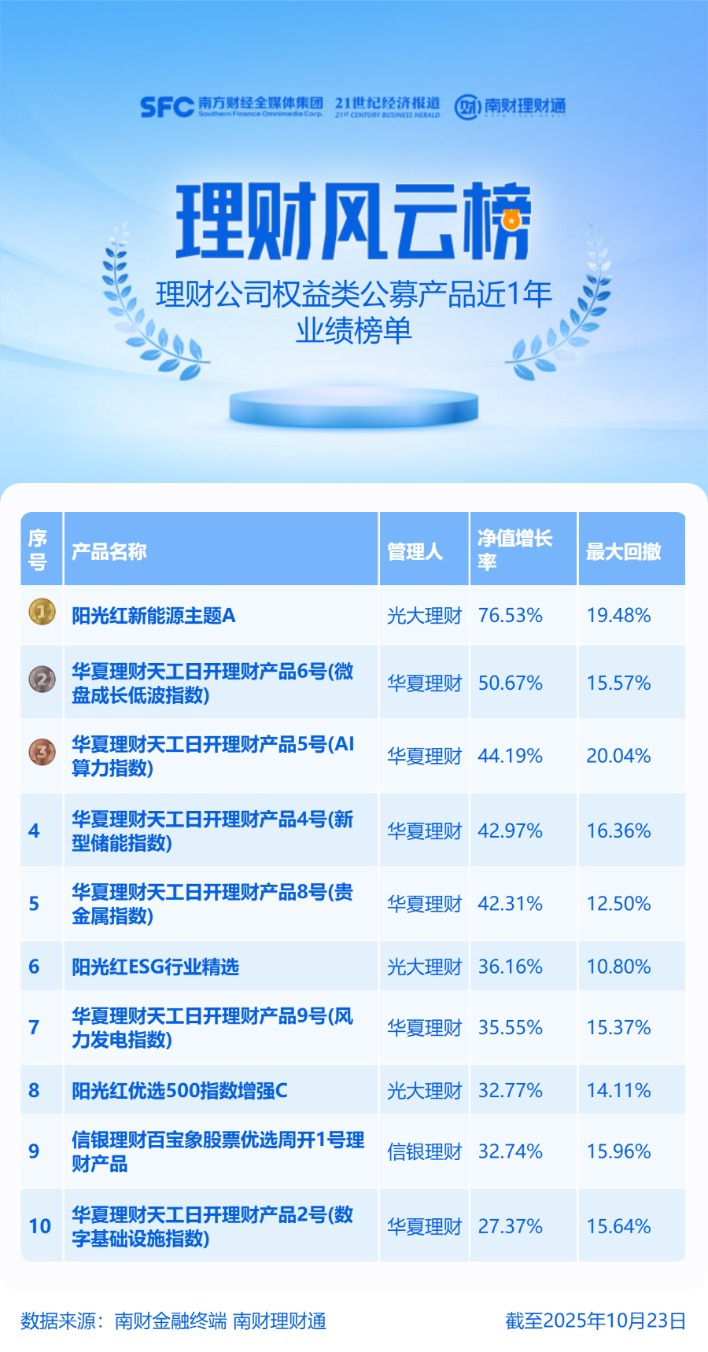 产品统计范围为理财公司权益类理财公募产品,统计截止日期为2025年10月23日,统计区间为近一年。