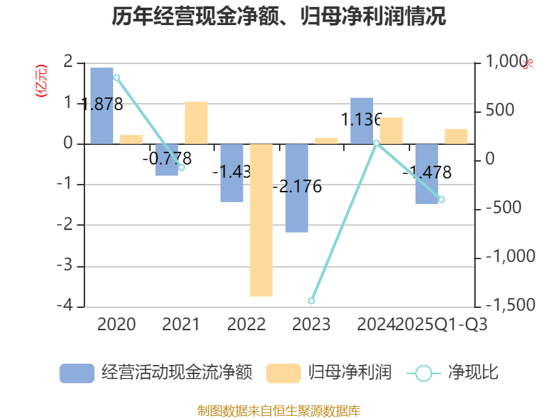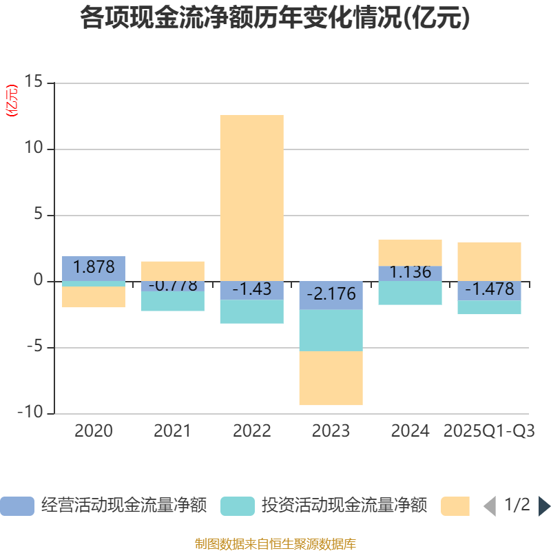 2025年前三季度,公司经营活动现金流净额为-1.48亿元,同比减少2.06亿元;筹资活动现金流净额2.92亿元,同比增加1.58亿元;投资活动现金流净额-1.03亿元,上年同期为-1.33亿元。