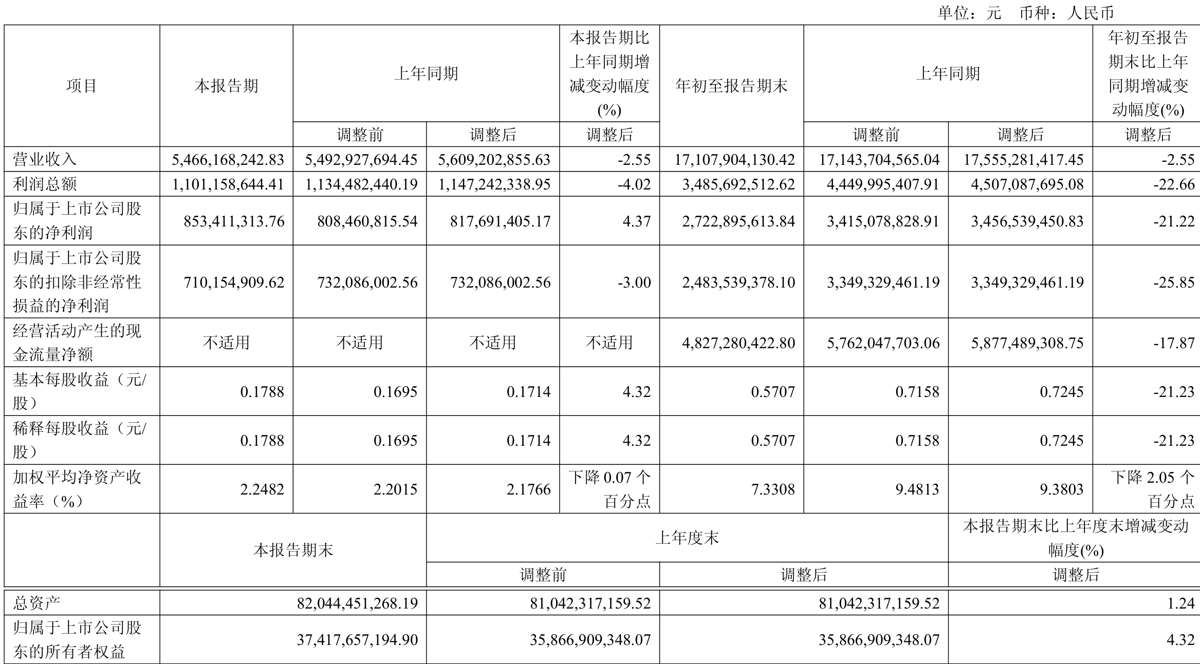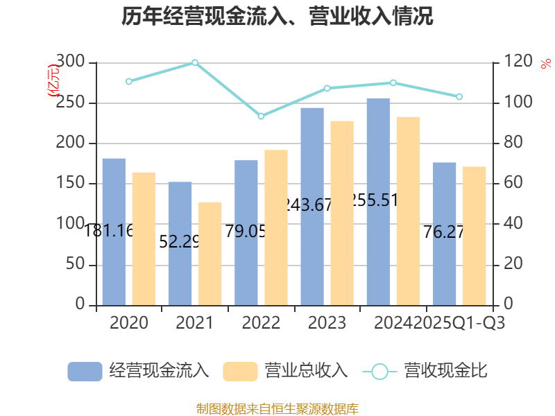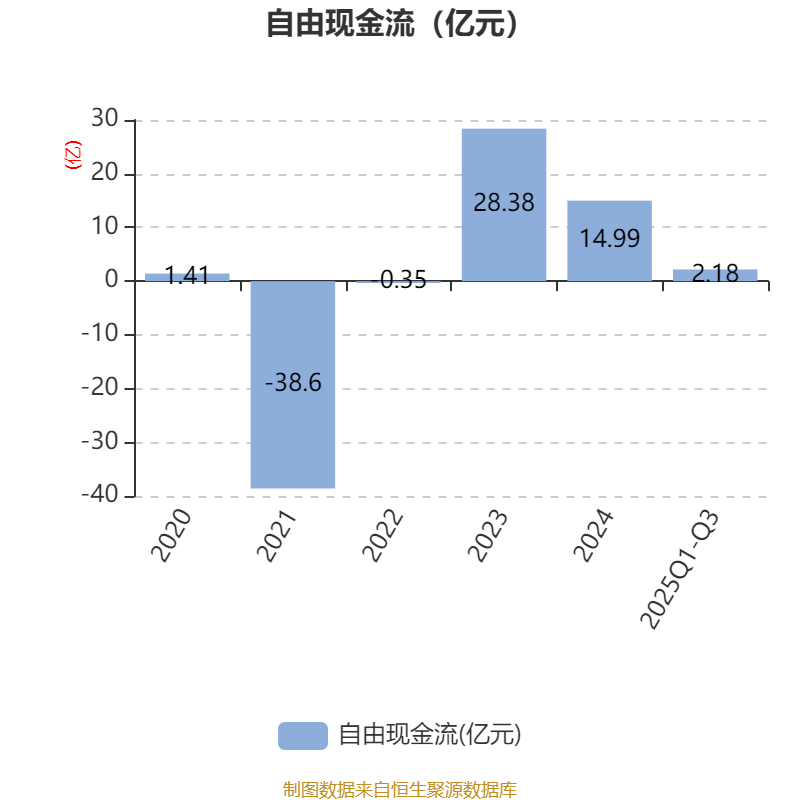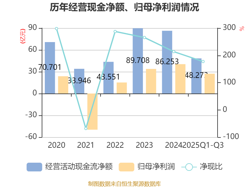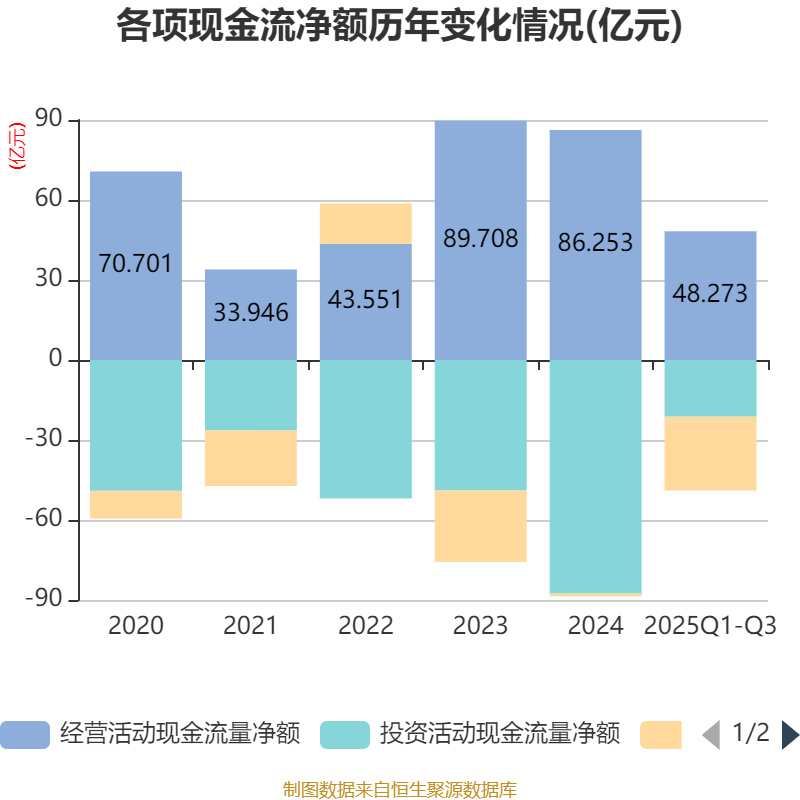 2025年前三季度,公司经营活动现金流净额为48.27亿元,同比下降17.87%;筹资活动现金流净额-27.67亿元,同比减少8.7亿元;投资活动现金流净额-21.26亿元,上年同期为-53.24亿元。