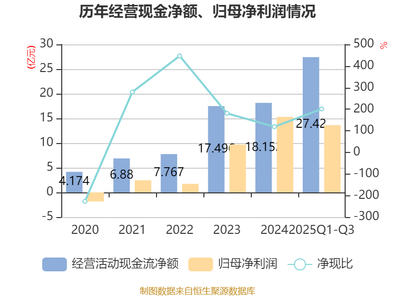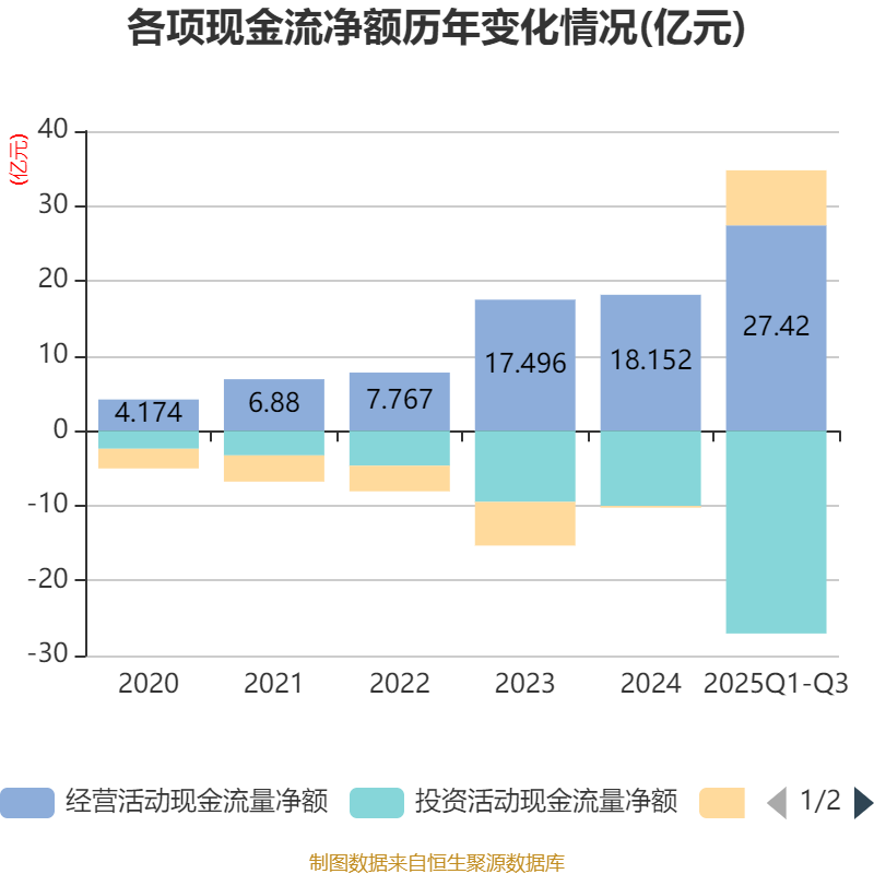 2025年前三季度,公司经营活动现金流净额为27.42亿元,同比增长118.66%;筹资活动现金流净额7.35亿元,同比增加10.08亿元;投资活动现金流净额-27.06亿元,上年同期为-8.11亿元。