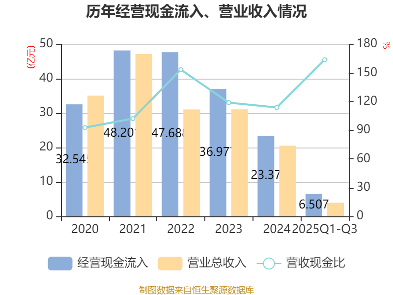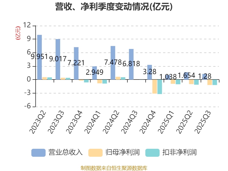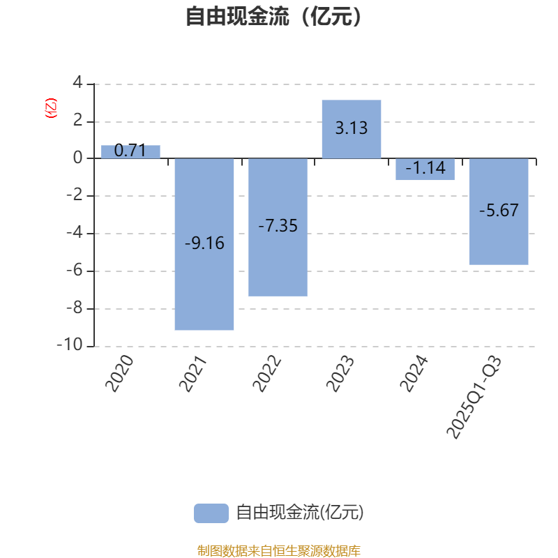 2025年前三季度,公司经营活动现金流净额为-9598.58万元,同比增加1.25亿元;筹资活动现金流净额-1.23亿元,同比减少2.2亿元;投资活动现金流净额1927.49万元,上年同期为-3628.02万元。
