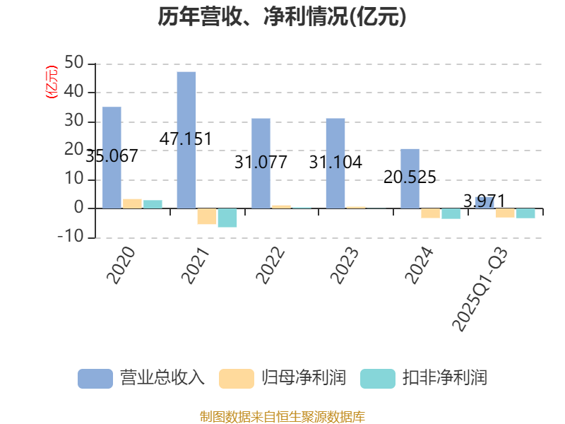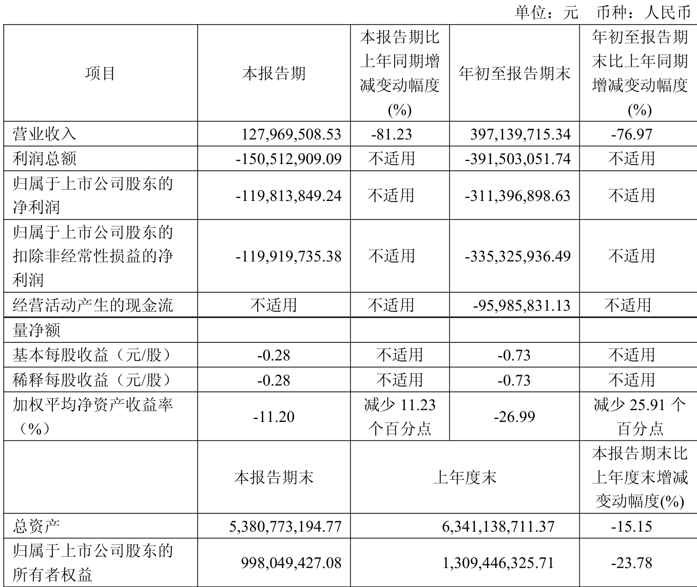 中证智能财讯亚士创能(603378)10月31日披露2025年第三季度报告。前三季度公司实现营业总收入3.97亿元,同比下降76.97%;归母净利润亏损3.11亿元,上年同期亏损1859.97万元;扣非净利润亏损3.35亿元,上年同期亏损3669.7万元;经营活动产生的现金流量净额为-9598.58万元,上年同期为-2.21亿元;报告期内,亚士创能基本每股收益为-0.73元,加权平均净资产收益率为-26.99%。
