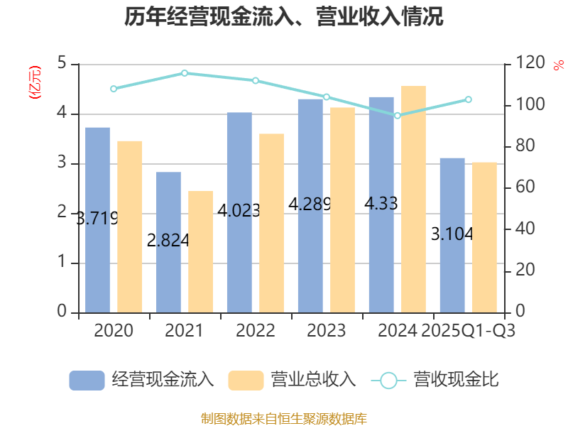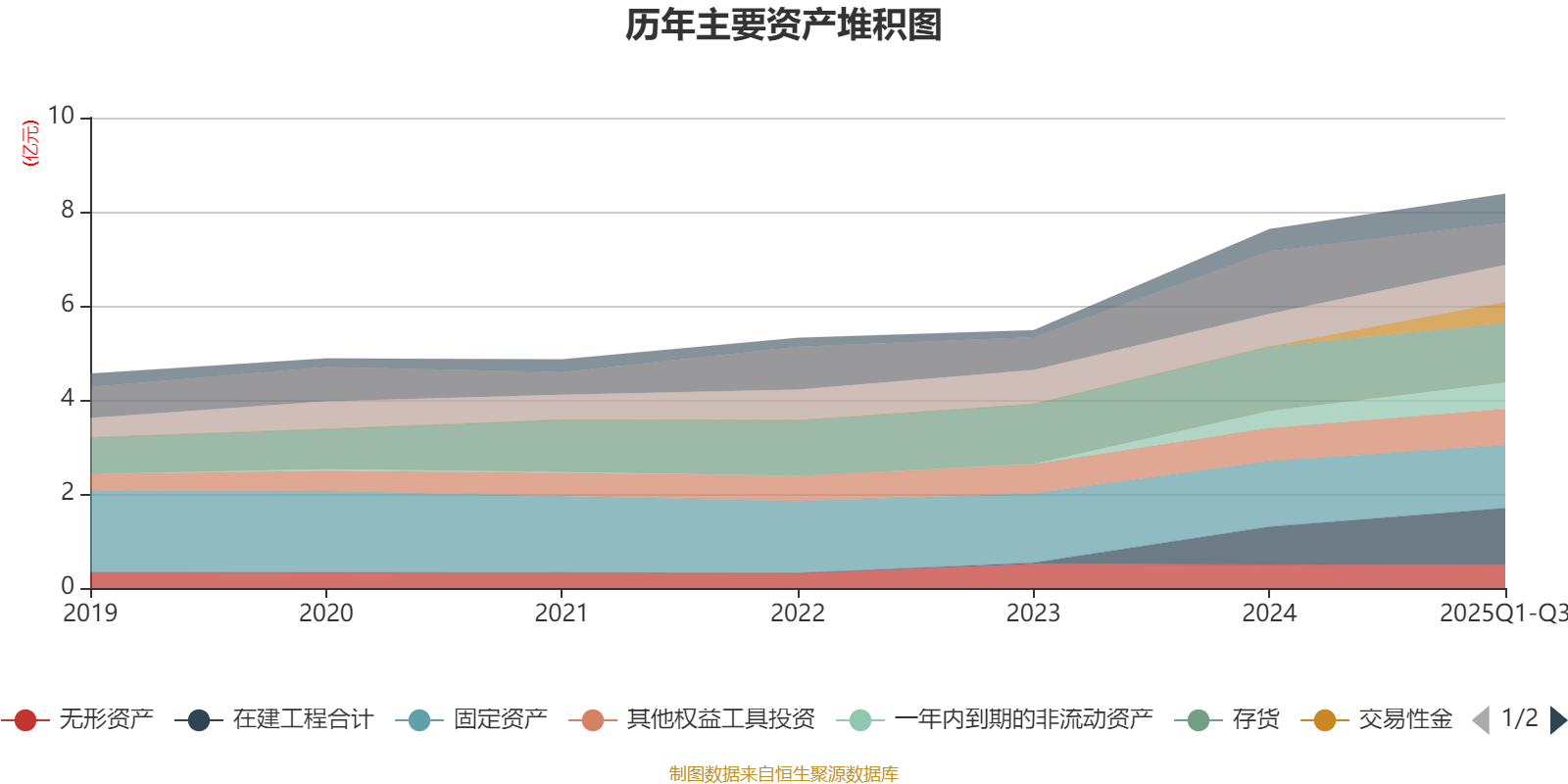 资产重大变化方面,截至2025年三季度末,公司货币资金较上年末减少32.39%,占公司总资产比重下降6.68个百分点;交易性金融资产合计占公司总资产的5.37%,上年末为0;在建工程合计较上年末增加50.54%,占公司总资产比重上升3.9个百分点;存货较上年末减少8.22%,占公司总资产比重下降2.97个百分点。