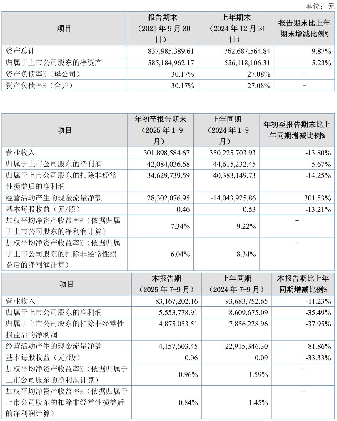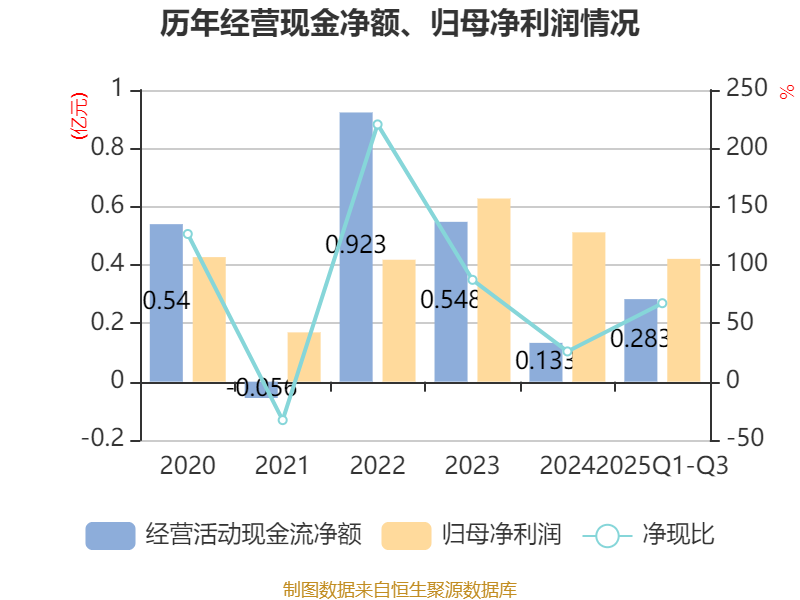 2025年前三季度,公司经营活动现金流净额为2830.21万元,同比增加4234.6万元;筹资活动现金流净额1386.51万元,同比减少1.18亿元;投资活动现金流净额-8508.77万元,上年同期为-8604.26万元。