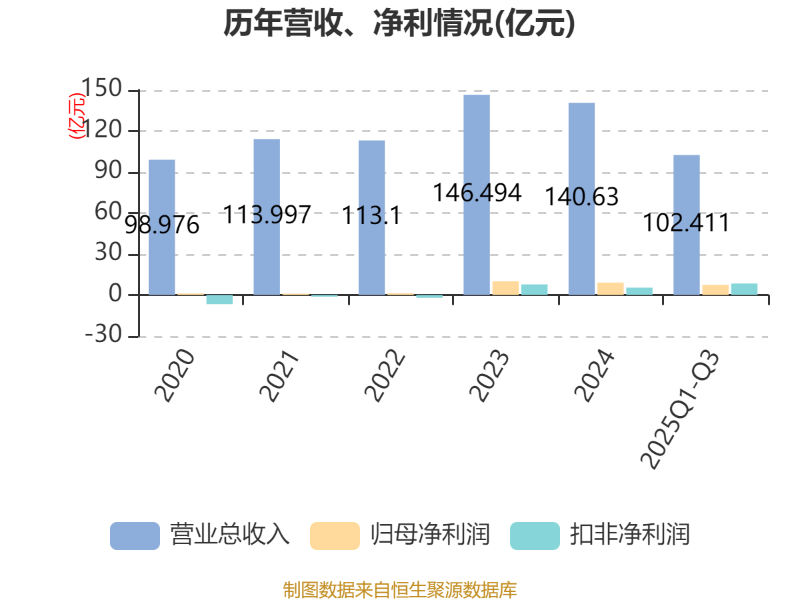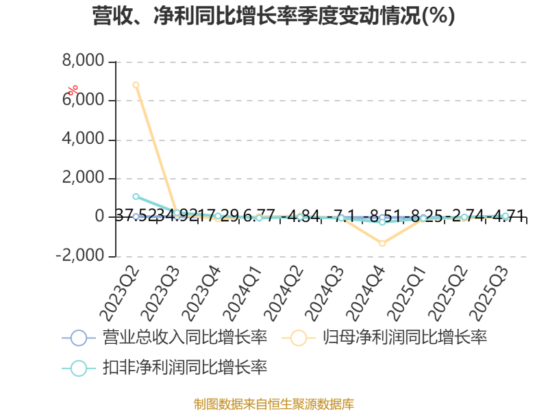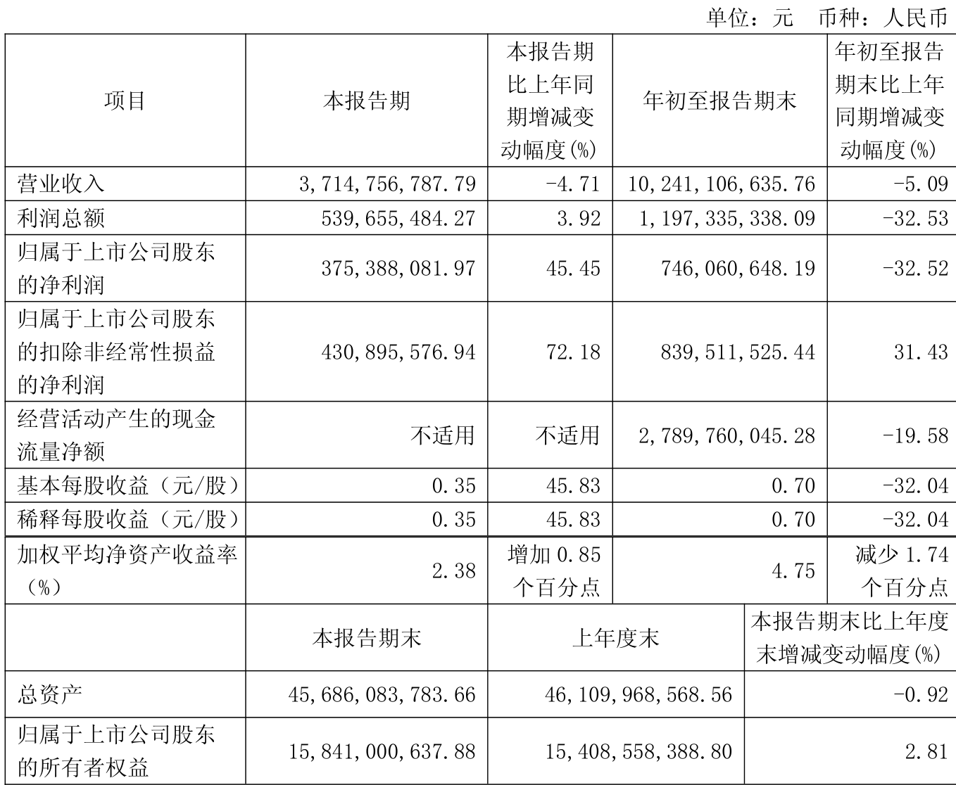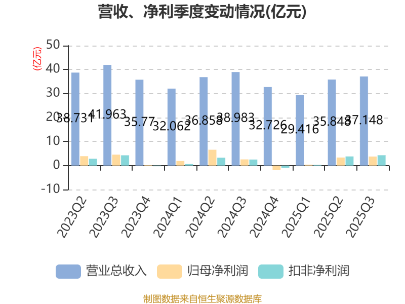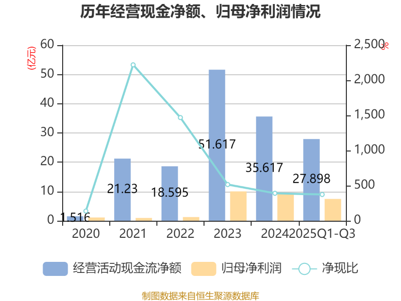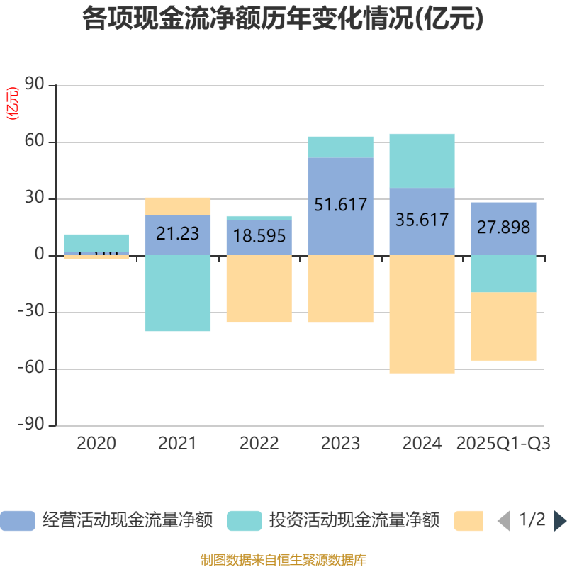 2025年前三季度,公司经营活动现金流净额为27.9亿元,同比下降19.58%;筹资活动现金流净额-36.2亿元,同比增加15.63亿元;投资活动现金流净额-19.63亿元,上年同期为28.07亿元。