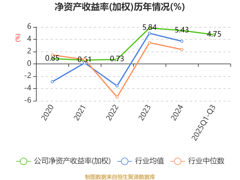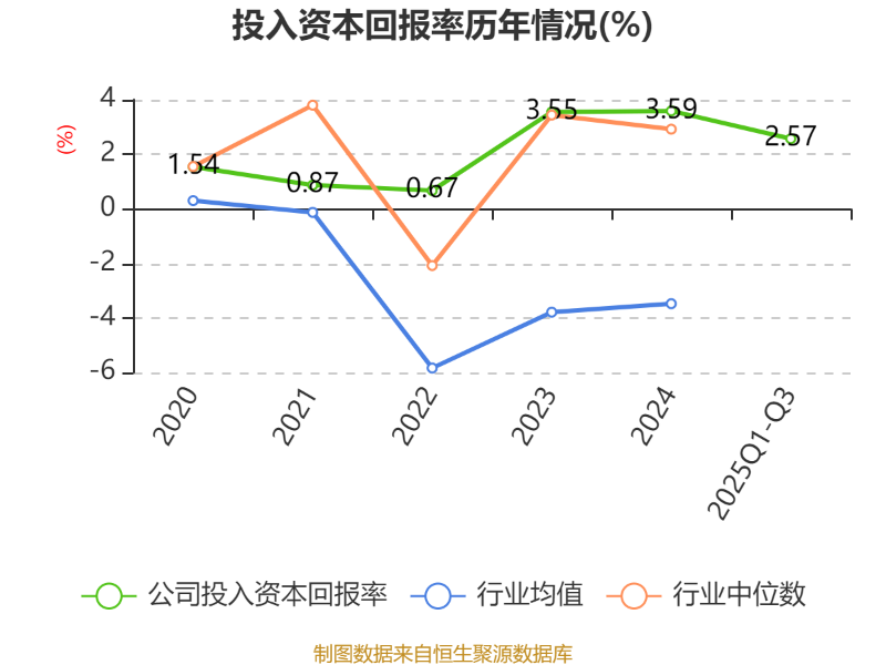 盈利能力方面, 2025年前三季度公司加权平均净资产收益率为4.75%,同比下降1.74个百分点。公司2025年前三季度投入资本回报率为2.57%,较上年同期下降1.17个百分点。