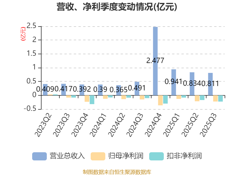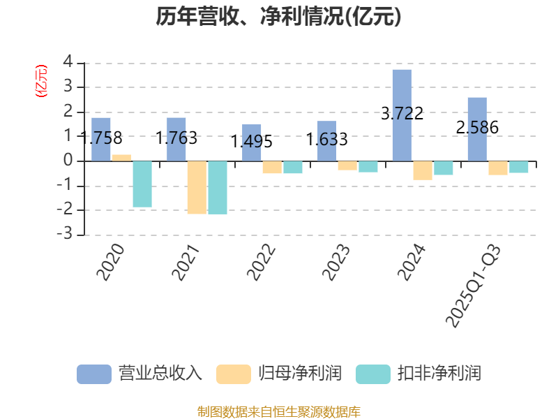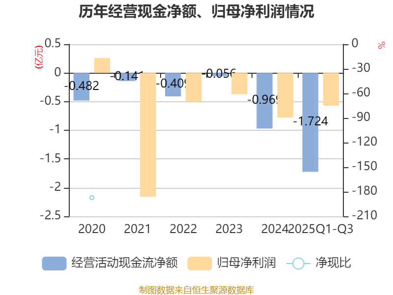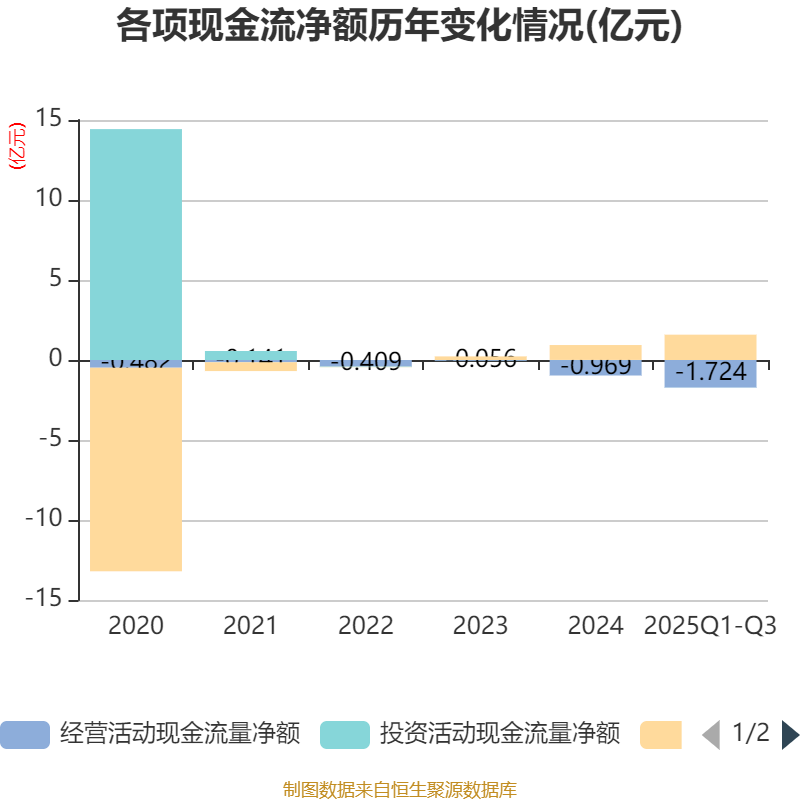 2025年前三季度,公司经营活动现金流净额为-1.72亿元,同比减少1.23亿元;筹资活动现金流净额1.58亿元,同比增加9816.16万元;投资活动现金流净额-61.06万元,上年同期为70.89万元。