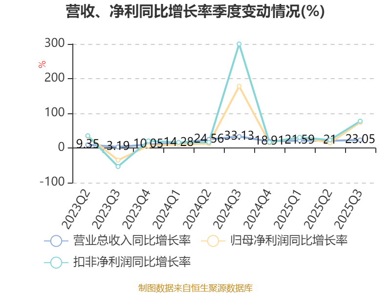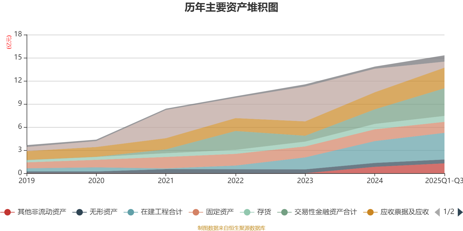 资产重大变化方面,截至2025年三季度末,公司货币资金较上年末减少74.1%,占公司总资产比重下降16.93个百分点;交易性金融资产合计较上年末增加88.7%,占公司总资产比重上升9.7个百分点;一年内到期的非流动资产占公司总资产的3.45%,上年末为0;其他非流动资产较上年末增加54.61%,占公司总资产比重上升2.39个百分点。
