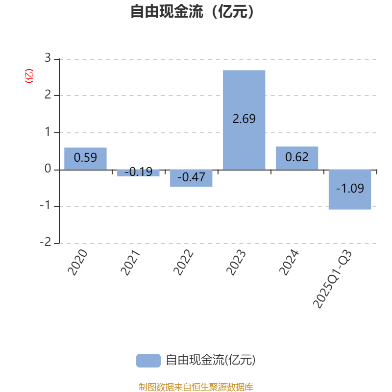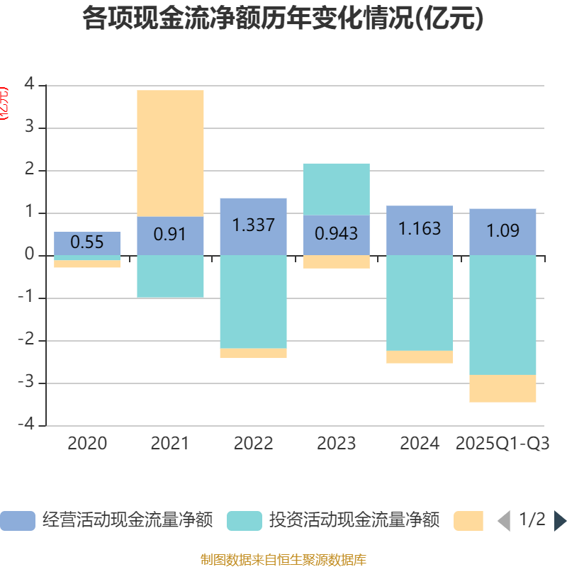 2025年前三季度,公司经营活动现金流净额为1.09亿元,同比增长26.4%;筹资活动现金流净额-6436.04万元,同比减少3531.29万元;投资活动现金流净额-2.82亿元,上年同期为-1.98亿元。