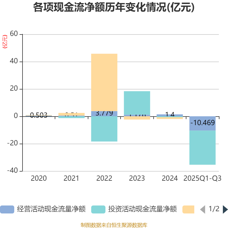 2025年前三季度,公司经营活动现金流净额为-10.47亿元,同比减少9.37亿元;筹资活动现金流净额-160.39万元,同比增加1.2亿元;投资活动现金流净额-24.95亿元,上年同期为-4627.73万元。