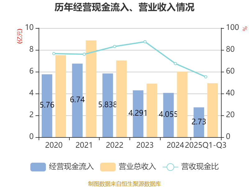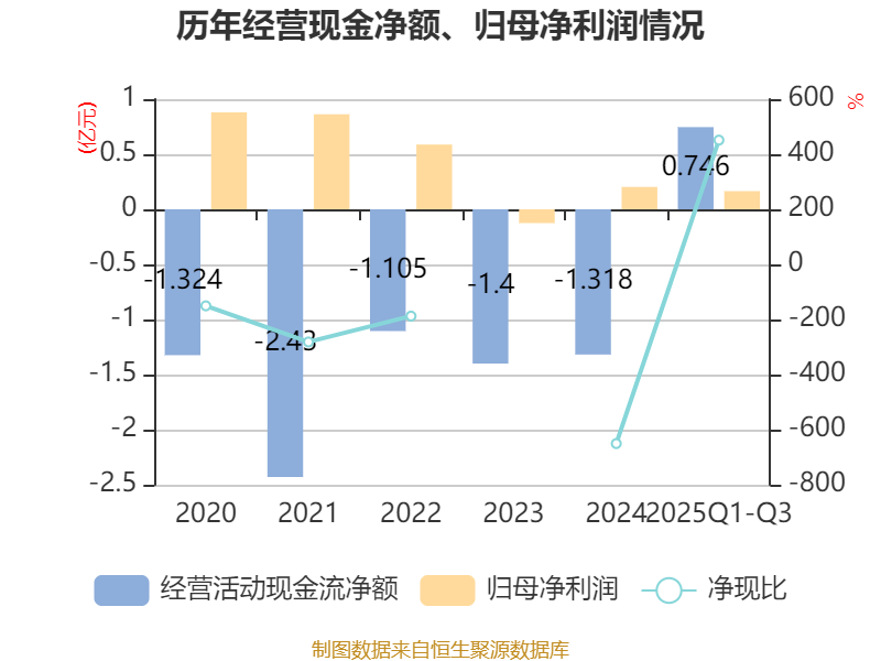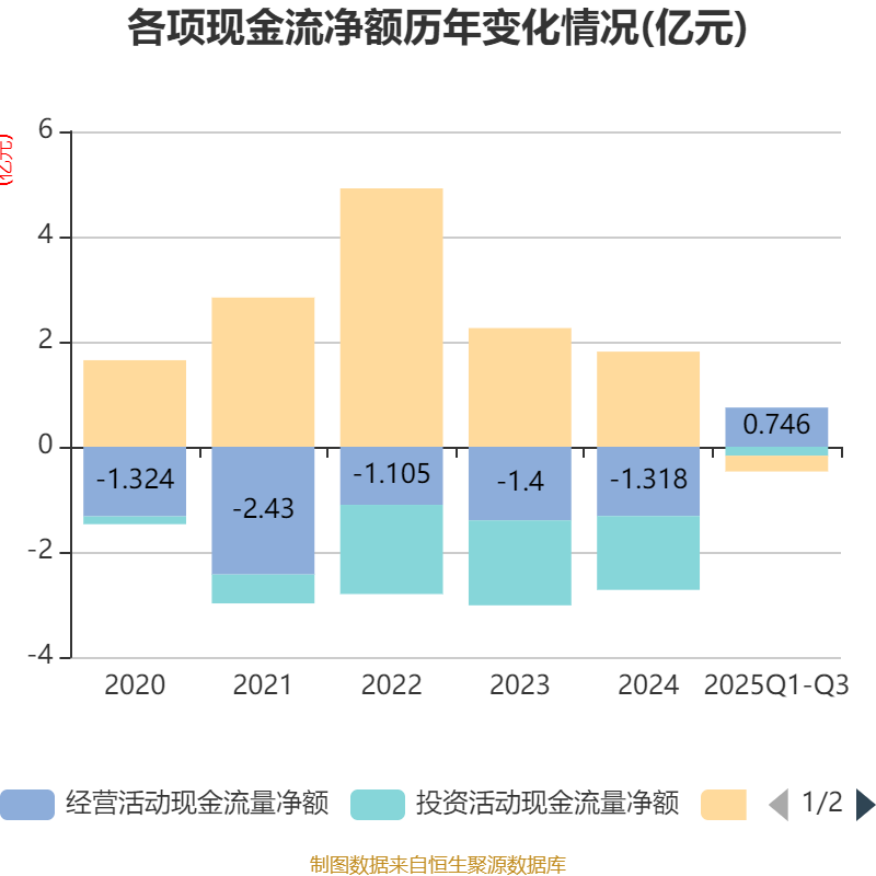 2025年前三季度,公司经营活动现金流净额为7456.59万元,同比增加9189.6万元;筹资活动现金流净额-3001.88万元,同比减少6923.37万元;投资活动现金流净额-1696.54万元,上年同期为-8948.11万元。