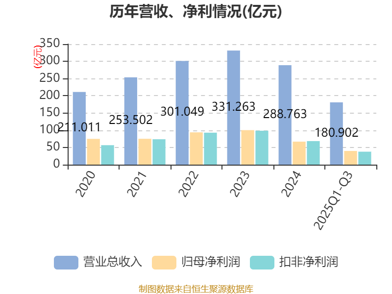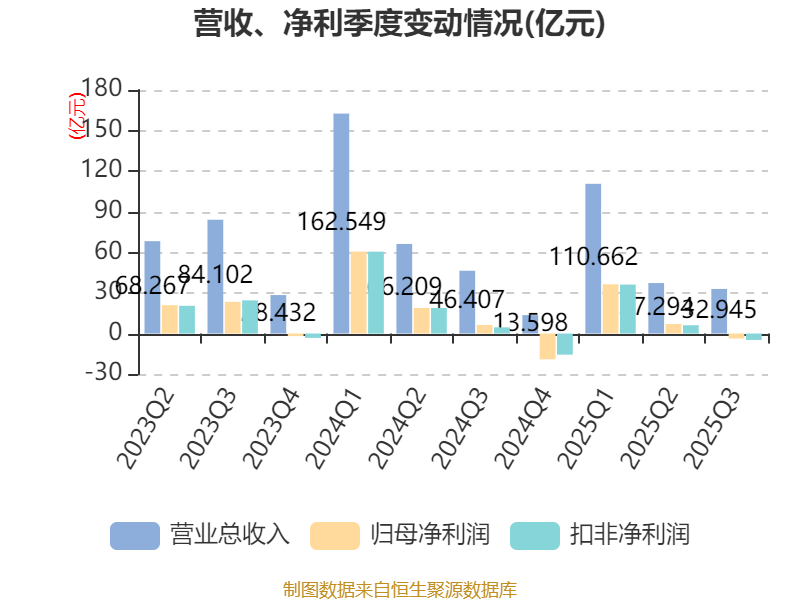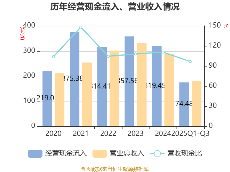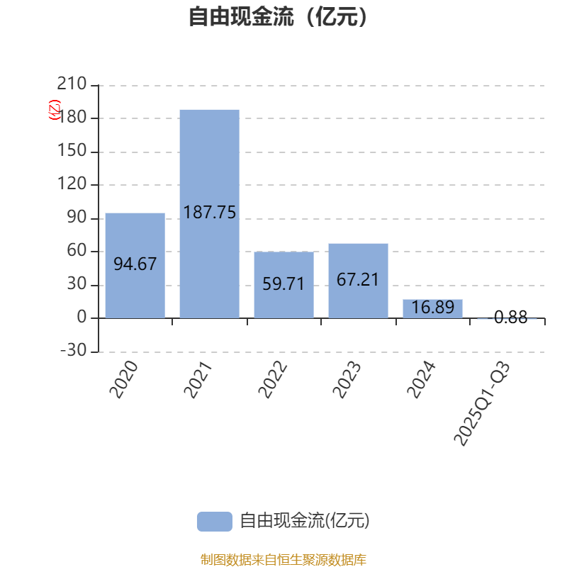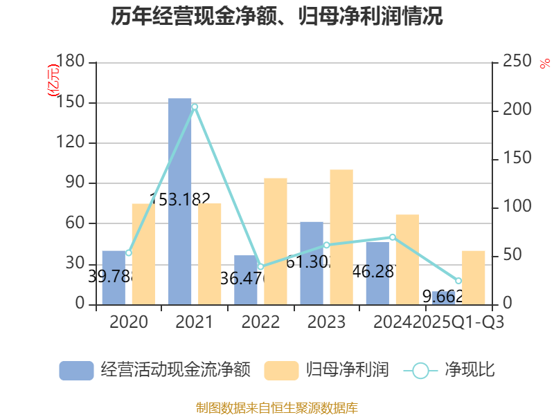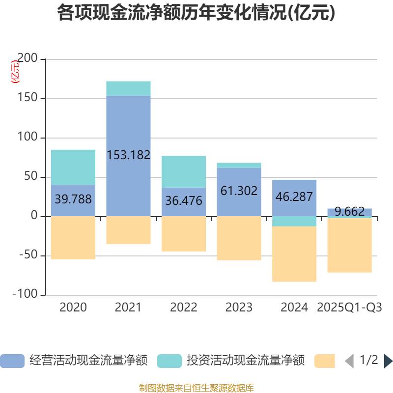 2025年前三季度,公司经营活动现金流净额为9.66亿元,同比下降72.06%;筹资活动现金流净额-69.13亿元,同比增加1.33亿元;投资活动现金流净额-2.58亿元,上年同期为-5.25亿元。