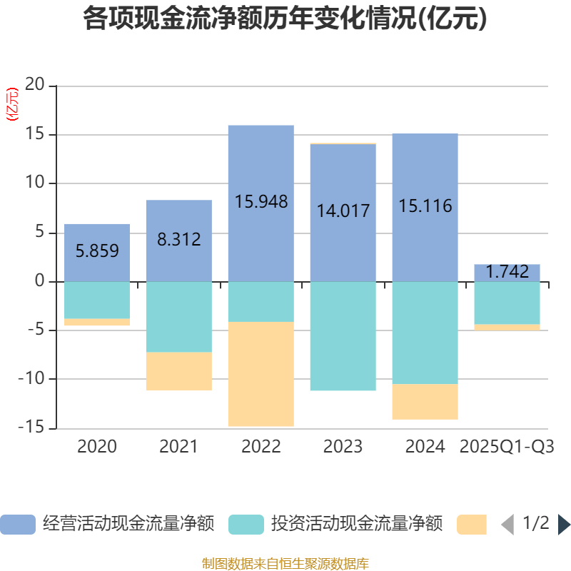 2025年前三季度,公司经营活动现金流净额为1.74亿元,同比下降9.83%;筹资活动现金流净额-6038.07万元,同比增加1.89亿元;投资活动现金流净额-4.4亿元,上年同期为-1.41亿元。