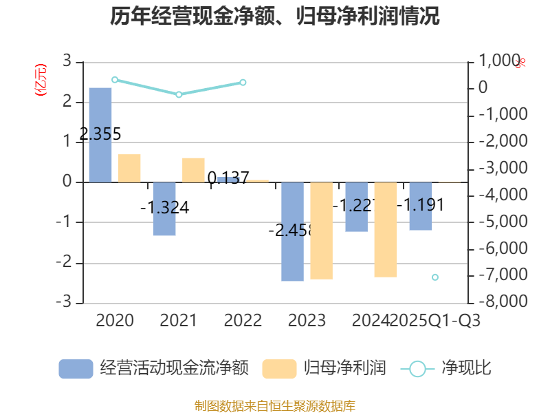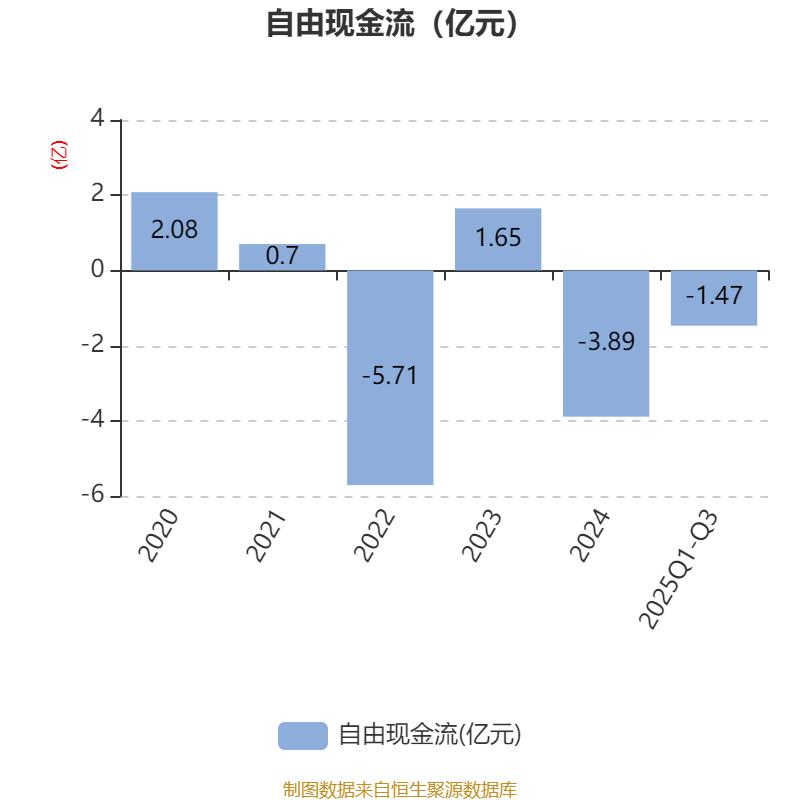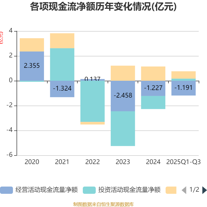 2025年前三季度,公司经营活动现金流净额为-1.19亿元,同比增加963.42万元;筹资活动现金流净额5886.45万元,同比减少5515.36万元;投资活动现金流净额1705.17万元,上年同期为-1.08亿元。