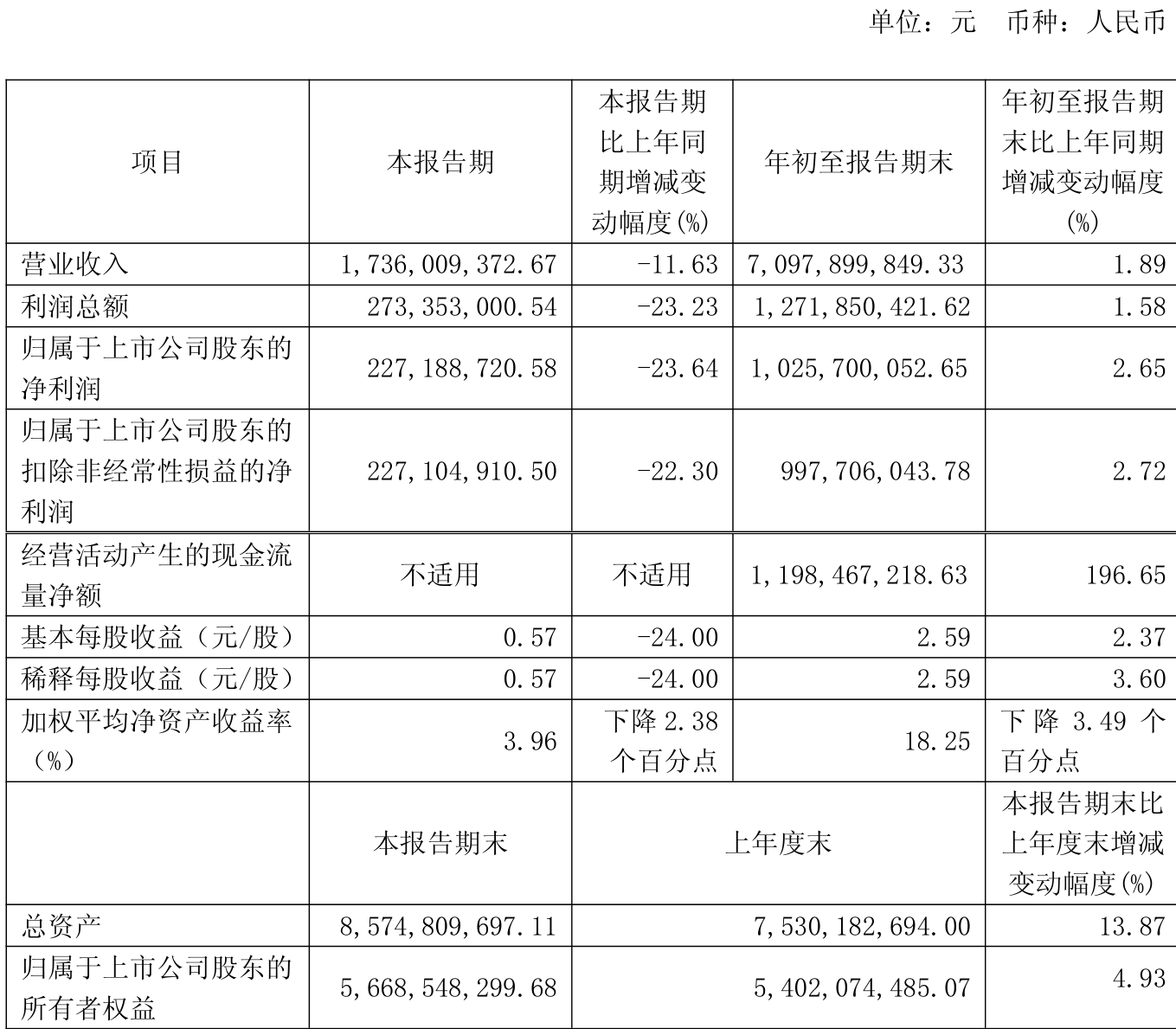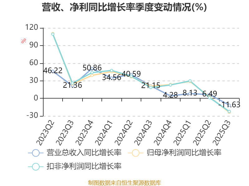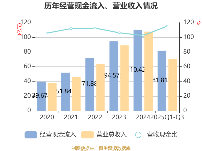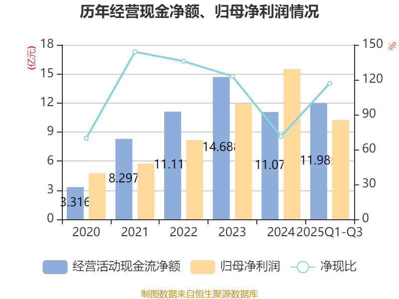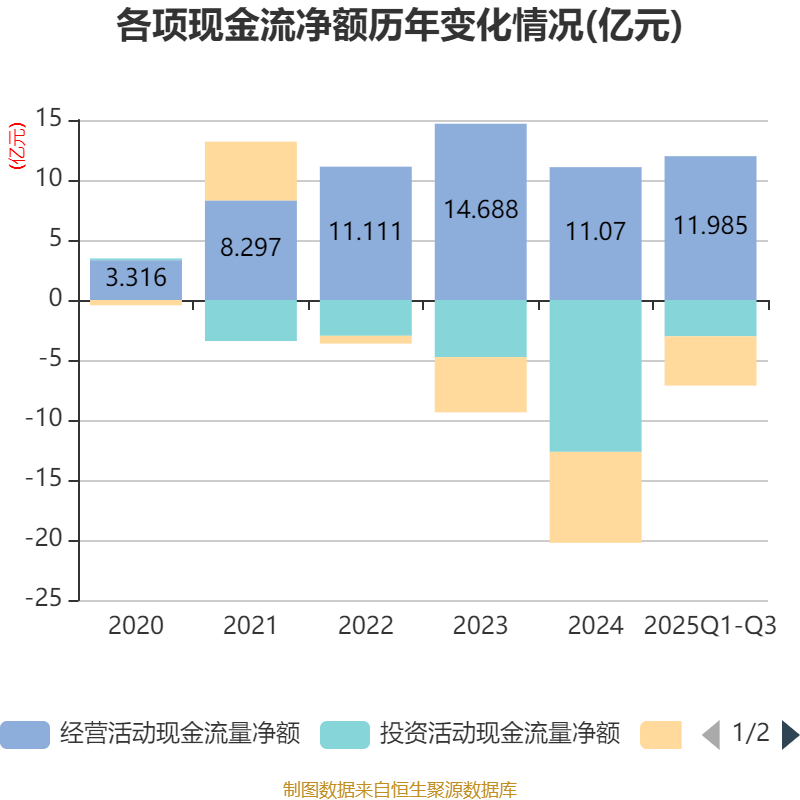 2025年前三季度,公司经营活动现金流净额为11.98亿元,同比增长196.65%;筹资活动现金流净额-4.11亿元,同比增加2.36亿元;投资活动现金流净额-3.02亿元,上年同期为-10.27亿元。