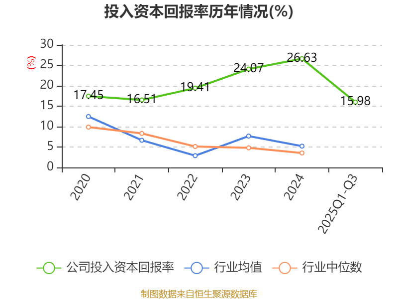 盈利能力方面, 2025年前三季度公司加权平均净资产收益率为18.25%,同比下降3.49个百分点。公司2025年前三季度投入资本回报率为15.98%,较上年同期下降1.71个百分点。
