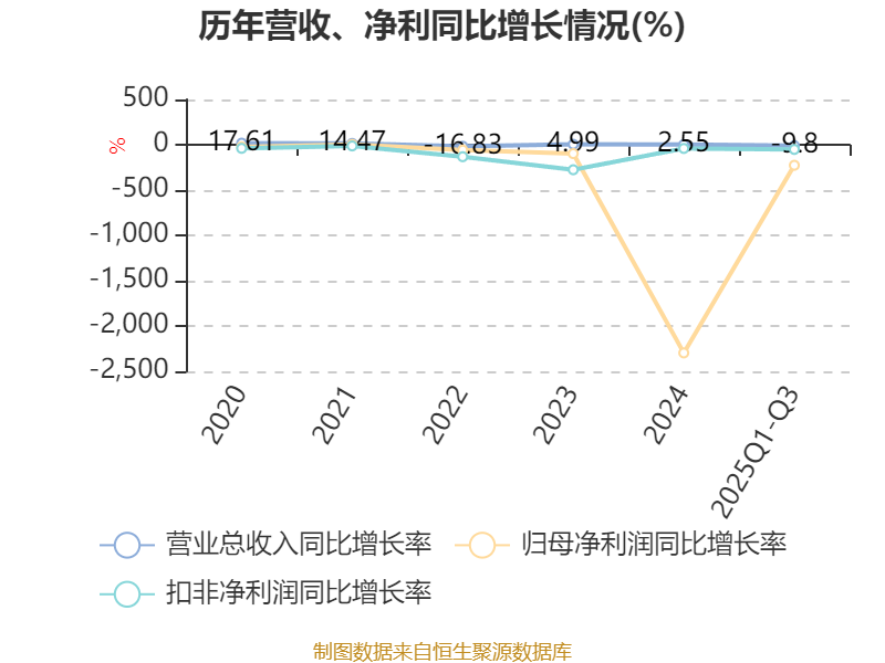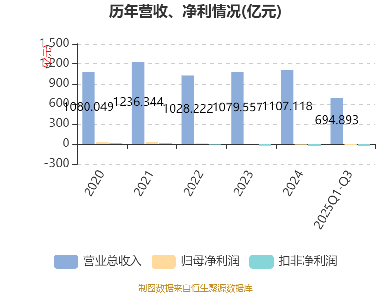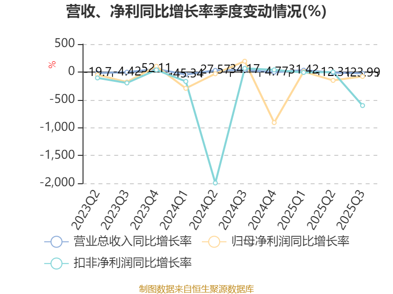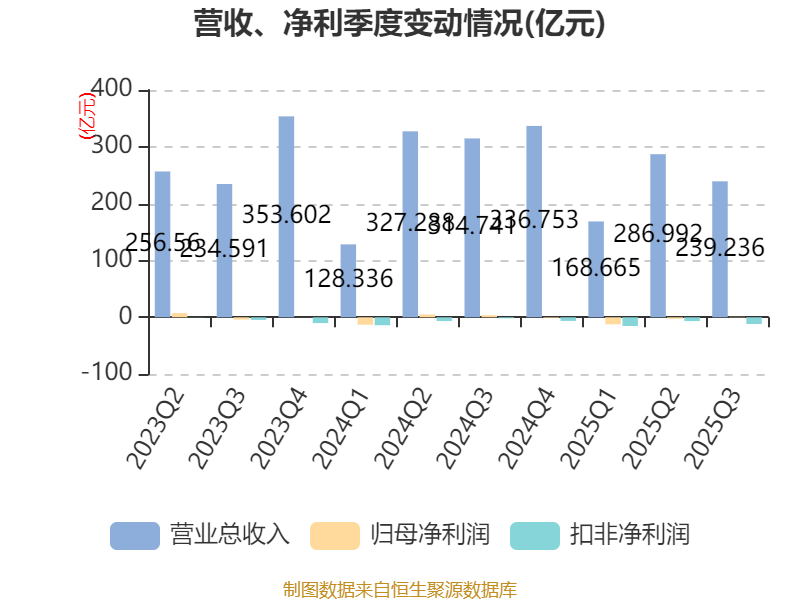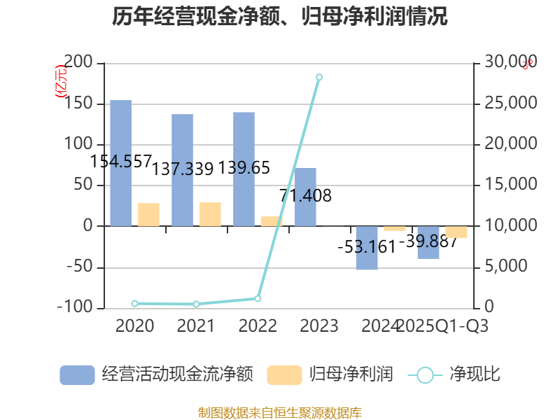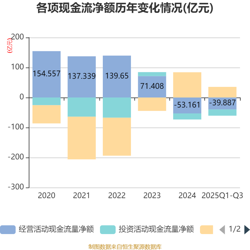 2025年前三季度,公司经营活动现金流净额为-39.89亿元,同比增加54.68亿元;筹资活动现金流净额35.44亿元,同比减少72.53亿元;投资活动现金流净额-20.73亿元,上年同期为-33.95亿元。
