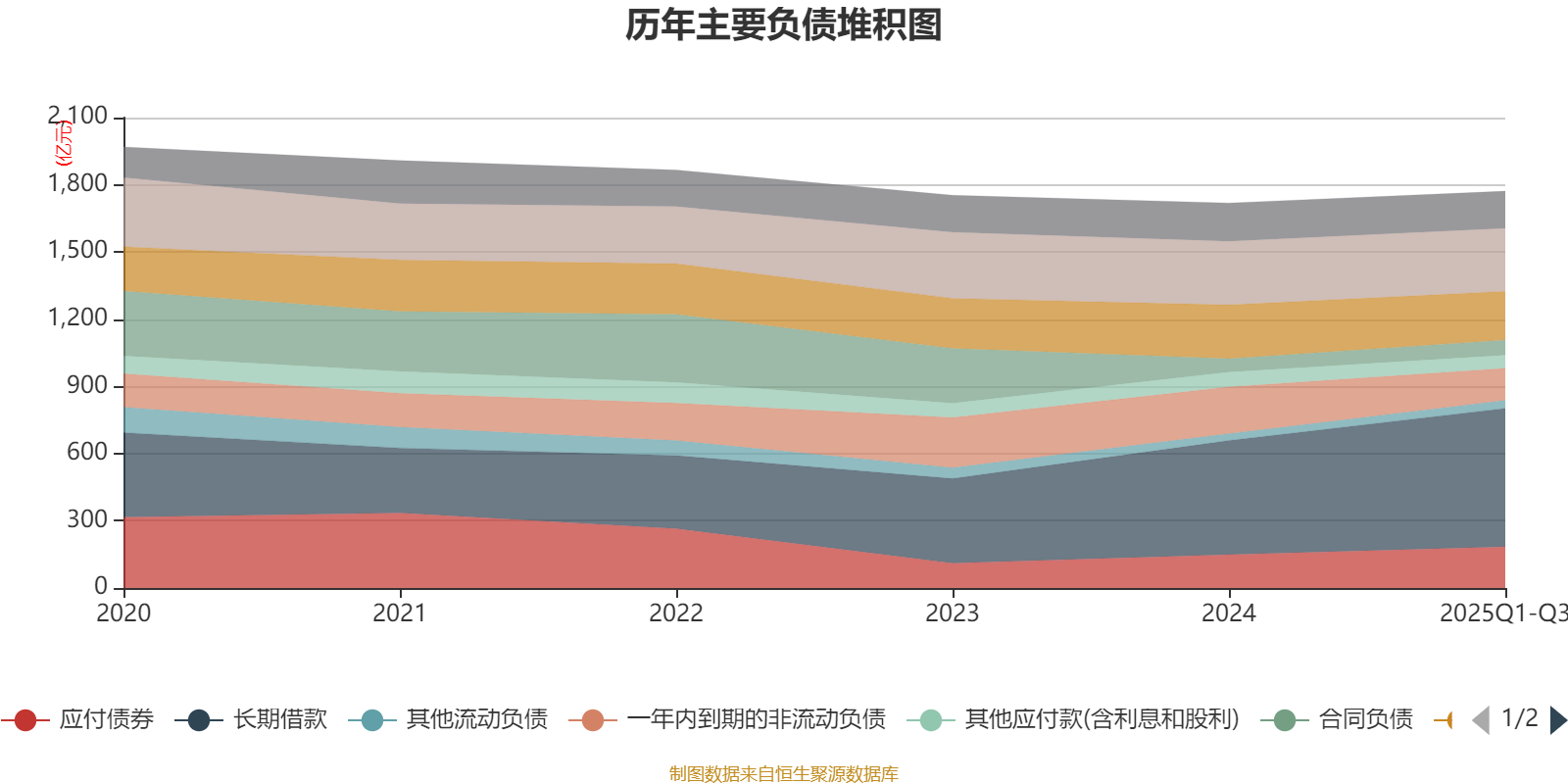 负债重大变化方面,截至2025年三季度末,公司长期借款较上年末增加21.39%,占公司总资产比重上升3.86个百分点;一年内到期的非流动负债较上年末减少31.31%,占公司总资产比重下降2.53个百分点;应付债券较上年末增加23.5%,占公司总资产比重上升1.25个百分点;应付短期融资款较上年末减少49.82%,占公司总资产比重下降1.15个百分点。